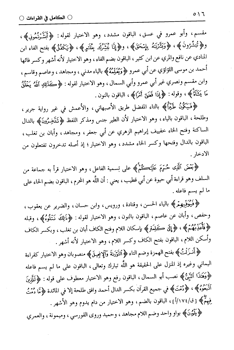 مقسم، وأَبُو عَمْرٍو في عسق، الباقون مشدد، وهو الاختيار لقوله: (أَبَشَّرْتُمُونِي)، و (تُبَشِّرُونَ)، (وَبَشَّرْنَاهُ بِإِسْحَاقَ)، و (إِنَّا نُبَشِّرُكَ بِغُلَامٍ)، (يَكْفُلُ) بفتح الفاء ابن المنادي عن نافع والمري عن ابْن كَثِيرٍ، الباقون بضم الفاء، وهو الاختيار لأنه أشهر وكسر فائها أحمد بن موسى اللؤلؤي عن أَبِي عَمْرٍو (وَيُعَلِّمُهُ) بالياء مدني، ومجاهد، وعَاصِم وقاسم، وابْن مِقْسَمٍ ونصري غير أَبِي عَمْرٍو وأبي السَّمَّال، وهو الاختيار لقوله: (كَذَلِكِ اللَّهُ يَخْلُقُ مَا يَشَاءُ)، وقوله: (إِذَا قَضَى أَمْرًا)، الباقون بالنون.