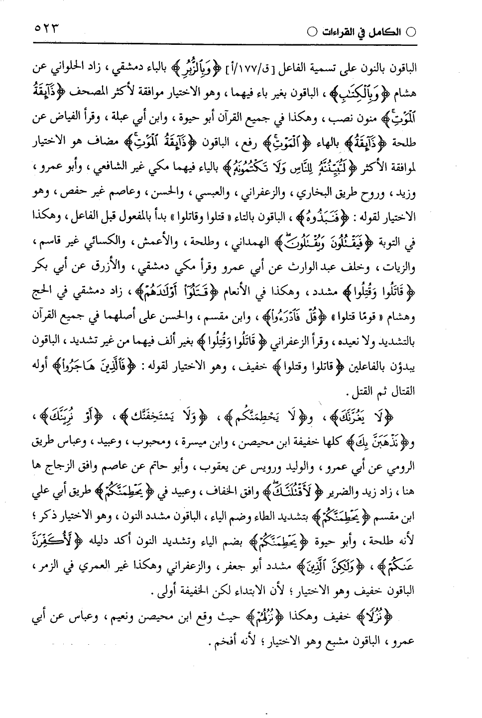 الباقون بالنون على تسمية الفاعل، (وَبِالزُّبُرِ) بالباء دمشقي، زاد الحلواني عن هشام (وَبِالْكِتَابِ)، الباقون بغير باء فيهما، وهو الاختيار موافقة لأكثر المصحف (ذَائِقَةٌ الْمَوْتَ) منون نصب، وهكذا في جميع القرآن أبو حيوة، وابن أبي عبلة، وقرأ الفياض عن طَلْحَة (ذَائِقَه) بالهاء (الْمَوْتِ) رفع، الباقون (ذَائِقَةُ الْمَوْتِ) مضاف هو الاختيار لموافقة الأكثر (لَتُبَيِّنُنَّهُ لِلنَّاسِ وَلَا تَكْتُمُونَهُ) بالياء فيهما مكي غير الشافعي، وأَبُو عَمْرٍو، وزيد، وَرَوْحٌ طريق البخاري، والزَّعْفَرَانِيّ، والْعَبْسِيّ، والحسن، وعَاصِم غير حفص، وهو الاختيار لقوله: (فَنَبَذُوهُ)، الباقون بالتاء " قُتِلُوا وَقَاتَلُوا " بدأ بالمفعول قبل الفاعل، وهكذا في التوبة (فَيُقْتَلُونَ وَيَقْتُلُونَ) الهمداني، وطَلْحَة، والْأَعْمَش، والكسائي غير قاسم، والزَّيَّات، وخلف عبد الوارث عن أَبِي عَمْرٍو وقرأ مكي دمشقي، والأزرق عن أبي بكر (قَاتَلُوا وَقُتِّلُوا) مشدد، وهكذا في الأنعام (قَتَّلُوا أَوْلَادَهُمْ)، زاد دمشقي في الحج وهشام " قومًا قتلوا " (قُلْ فَادْرَءُوا)، وابْن مِقْسَمٍ، والحسن على أصلهما في جميع القرآن بالتشديد ولا نعيده، وقرأ الزَّعْفَرَانِيّ (قَتَلُوا وَقُتِلُوا) بغير ألف فيهما من غير تشديد، الباقون يبدؤن بالفاعلين (قاتلوا وقتلوا) خفيف، وهو الاختيار لقوله: (فَالَّذِينَ هَاجَرُوا) أوله القتال ثم القتل.