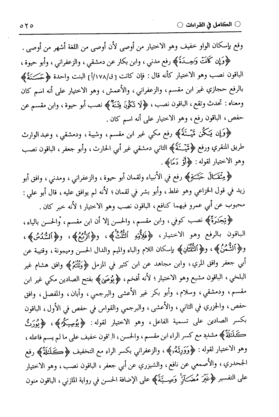 (مِثْقَالَ) رفع في الأنبياء ولقمان أبو حيوة، والزَّعْفَرَانِيّ، ومدني، وافق أبو زيد في قول الْخُزَاعِيّ وهو غلط، وأبو بشر في لقمان؛ لأنه لم يوافق عليه، قال أبو علي: محبوب عن أَبِي عَمْرٍو فيهما كنافع، الباقون نصب وهو الاختيار؛ لأنه خبر كان. (تِجَارَةً) نصب كوفي، وابْن مِقْسَمٍ، والحسن إلا أن ابْن مِقْسَمٍ، والحسن بالياء، الباقون بالرفع وهو الاختيار، (فَلِأُمِّهِ الثُّلُثُ)، و (الرُّبُعُ)، و (السُّدُسُ)، و (الثُّمُنُ)، و (الثلثُانِ) بإسكان اللام والباء والميم والدال الحسن وميمونة، وقُتَيْبَة عن أبي جعفر وافق المري، وابن مجاهد عن ابْن كَثِيرٍ في المزمل (وَثُلُثَهُ) وافق هشام غير الْبَلْخِيّ، الباقون مشبع وهو الاختيار، لأنه أفخم، (يُوصَى) بفتح الصادين مكي غير ابن مقسم، ودمشقي، وسلام، وأبو بكر غير الأعشى والبرجمي، وأبان، والمفصل، وافق حفص، والجزري في الثاني، والأعشى، والبرجمي والقواس في حفص في الأول، الباقون بكسر الصادين على تسمية الفاعل، وهو الاختيار لقوله: (يُوصِيكُمُ)، (يُورَثُ كَلَالَةً) مشدد مع كسر الراء ابْن مِقْسَمٍ، والحسن، والباقون خفيف على ما لم يسم فاعله، وهو الاختيار لقوله: (وَوَرِثَهُ)، والزَّعْفَرَانِيّ بكسر الراء مع التخفيف (كَلَالَةٌ) رفع الْجَحْدَرِيّ، والأصمعي عن نافع، والشيزري عن أبي جعفر، الباقون نصب، وهو الاختيار على التفسير (غَيْرَ مُضَارٍّ وَصِيَّةً) على الإضافة الحسن في رواية المازني، الباقون منون
