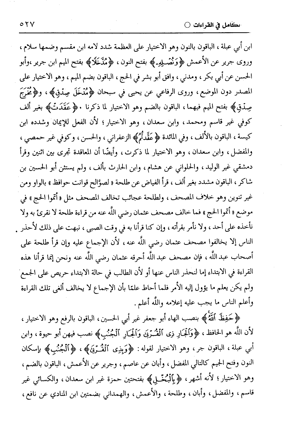 ابن أبي عبلة، الباقون بالنون وهو الاختيار على العظمة شدد لامه ابْن مِقْسَمٍ وضمها سلام، وروى جرير عن الْأَعْمَش (ونَصْلِهِ) بفتح النون، (مُدْخَلًا) بفتح الميم ابن جرير، وأبو الحسن عن أبي بكر، ومدني، وافق أبو بشر في الحج، الباقون بضم الميم، وهو الاختيار على المصدر دون الموضع، وروى الرفاعي عن يحيى في سبحان (مُدْخَلَ صِدْقٍ)، و (مُخْرَجَ صِدْقٍ) بفتح الميم فيهما، الباقون بالضم وهو الاختيار لما ذكرنا. (عَقَدَتْ) بغير ألف كوفي غير قاسم ومحمد، وابْن سَعْدَانَ، وهو الاختيار؛ لأن الفعل للإيمان وشدده ابن كيسة، الباقون بالألف، وفي المائدة (عَقَّدْتُمُ) الزَّعْفَرَانِيّ، والحسن، وكوفي غير حمصي، والمفضل، وابْن سَعْدَانَ، وهو الاختيار لما ذكرت، وأيضًا أن المعاقدة تجرى بين اثنين وقرأ دمشقي غير الوليد، والحلواني عن هشام، وابن الحارث بألف، ولم يستثن أبو الحسين بن شاكر، الباقون مشدد بغير ألف، قرأ الفياض عن طَلْحَة " لصوال قوانت حوافظ " بالواو ومن غير تنوين وهو خلاف المصحف، ولطَلْحَة عجائب تخالف المصحف مثل " أتموا الحج " في موضع " أتموا الحج " فما خالف مصحف عثمان رضي اللَّه عنه من قراءة طَلْحَة لا نقرئ به ولا نأخذه على أحد، ولا نأمر بقرأته، وإن كنا قرأنا به في وقت الصبى، نبهت على ذلك لأحذر. الناس إلا يخالفوا مصحف عثمان رضي اللَّه عنه، لأن الإجماع عليه وإن قرأ طَلْحَة على أصحاب عبد اللَّه، فإن مصحف عبد اللَّه أحرقه عثمان رضي اللَّه عنه ونحن إنما قرأنا هذه اقراءة في الابتداء إما لنحذر الناس عنها أو لأن الطالب في حالة الابتداء حريص على الجمع ولم يكن يعلم ما يؤول إليه الأمر فلما أحاط علمًا بأن الإجماع لا يخالف ألغى تلك اقراءة وأعلم الناس ما حا عليه إعلامه والله أعلم.