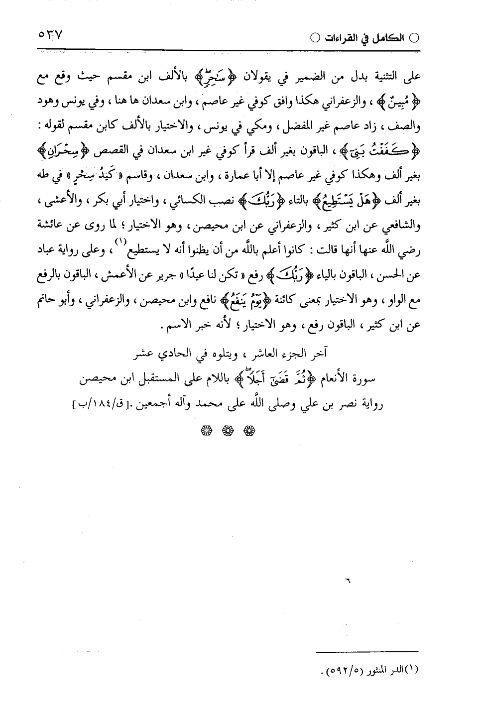 سورة الأنعام (ثُمَّ قَضَى أَجَلًا) باللام على المستقبل ابن مُحَيْصِن رواية نصر بن علي وصلى اللَّه على محمد وآله أجمعين.