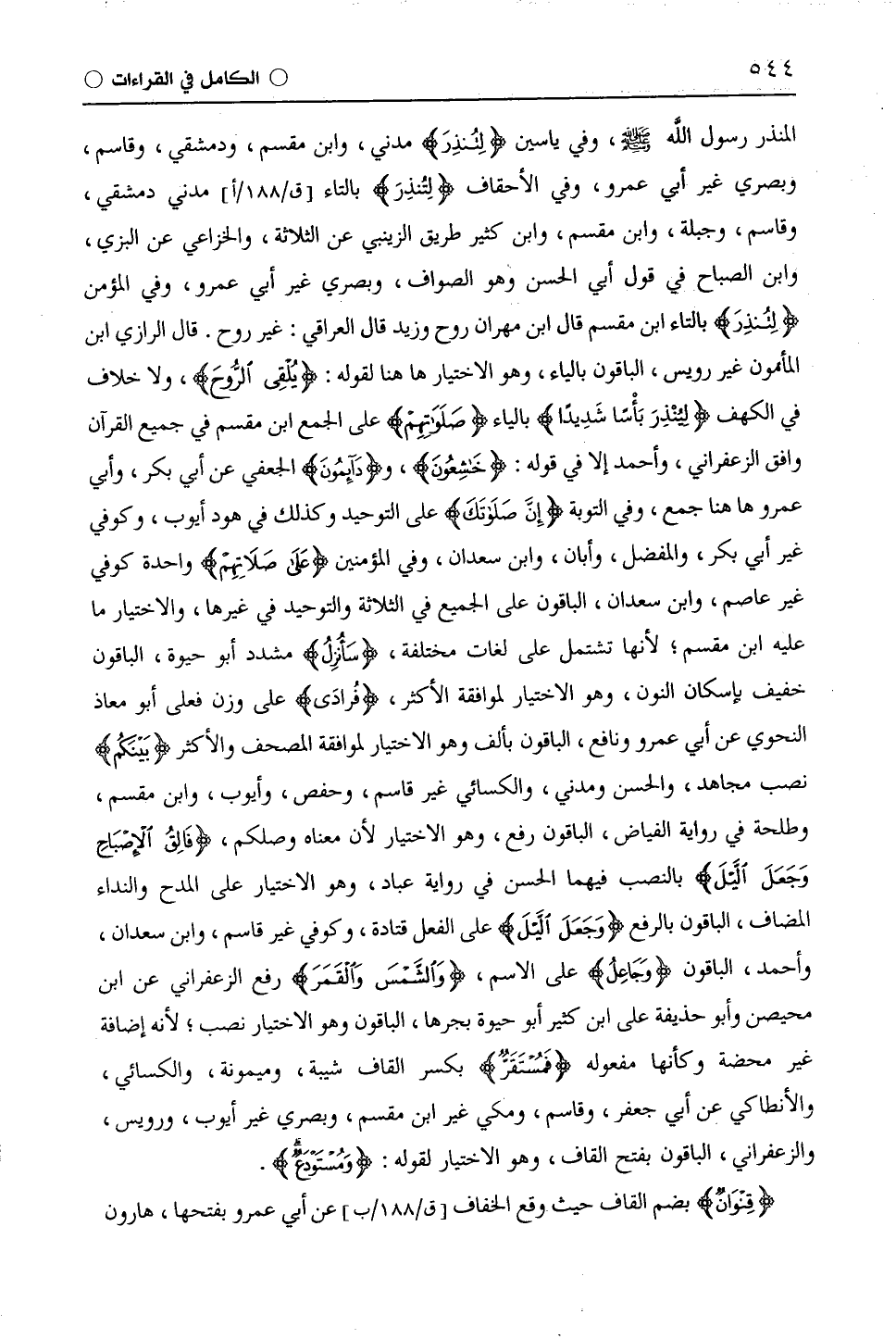 المنذر رسول اللَّه - صلى الله عليه وسلم -، وفي ياسين (لِتُنْذِرَ) مدني، وابْن مِقْسَمٍ، ودمشقي، وقاسم، وبصري غير أَبِي عَمْرٍو، وفي الأحقاف (لِتُنذِرَ) بالتاء مدني دمشقي، وقاسم، وجبلة، وابْن مِقْسَمٍ، وابْن كَثِيرٍ طريق الزَّيْنَبِيّ عن الثلاثة، والْخُزَاعِيّ عن البزي، وابْن الصَّبَّاحِ فى قول أبي الحسن وهو الصواف، وبصري غير أَبِي عَمْرٍو، وفي المؤمن (لِتُنْذِرَ) بالتاء ابْن مِقْسَمٍ قال ابن مهران روح وزيد قال العراقي: غير روح. قال الرَّازِيّ ابن المأمون غير رويس، الباقون بالياء، وهو الاختيار ها هنا لقوله: (يُلْقِي الرُّوحَ)، ولا خلاف في الكهف (لِيُنْذِرَ بَأْسًا شَدِيدًا) بالياء (صَلَواتِهِمْ) على الجمع ابْن مِقْسَمٍ في جميع القرآن وافق الزَّعْفَرَانِيّ، وأحمد إلا في قوله: (خَاشِعُونَ)، و (دَائِمُونَ) الجعفي عن أبي بكر، وأبي عمرو ها هنا جمع، وفي التوبة (إِنَّ صَلَاتَكَ) على التوحيد وكذلك في هود أيوب، وكوفي غير أبي بكر، والمفضل، وأبان، وابْن سَعْدَانَ، وفي المؤمنين (عَلَى صَلَاتِهِم) واحدة كوفي غير عَاصِم، وابْن سَعْدَانَ، الباقون على الجميع في الثلاثة والتوحيد في غيرها، والاختيار ما عليه ابْن مِقْسَمٍ، لأنها تشتمل على لغات مختلفة، (سَأُنْزِلُ) مشدد أبو حيوة، الباقون خفيف بإسكان النون، وهو الاختيار لموافقة الأكثر، (فُرَادَى) على وزن فعلى أبو معاذ النحوي عن أَبِي عَمْرٍو ونافع، الباقون بألف وهو الاختيار لموافقة المصحف والأص (بَيْنَكُمْ) نصب مجاهد، والحسن ومدني، والكسائي غير قاسم، وحفص، وأيوب، وابْن مِقْسَمٍ، وطَلْحَة في رواية الفياض، الباقون رفع، وهو الاختيار لأن معناه وصلكم، (فَالِقُ الْإِصْبَاحِ وَجَعَلَ اللَّيْلَ) بالنصب فيهما الحسن في رواية عباد، وهو الاختيار على المدح والنداء المضاف، الباقون بالرفع (وَجَعَلَ اللَّيْلَ) على الفعل قَتَادَة، وكوفي غير قاسم، وابْن سَعْدَانَ، وأحمد، الباقون (وجاعِل) على الاسم، (وَالشَّمْسَ وَالْقَمَرَ) رفع الزَّعْفَرَانِيّ عن ابن مُحَيْصِن وأبو حذيفة على ابْن كَثِيرٍ أبو حيوة بجرها، الباقون وهو الاختيار نصب، لأنه إضافة غير محضة وكأنها مفعوله (فَمُسْتَقَرٌّ) بكسر القاف شيبة، وميمونة، والكسائي، والإنطاكي عن أبي جعفر، وقاسم، ومكي غير ابْن مِقْسَمٍ، وبصري غير أيوب، ورويس، والزَّعْفَرَانِيّ، الباقون بفتح القاف، وهو الاختيار قوله: (وَمُسْتَوْدَعٌ).
