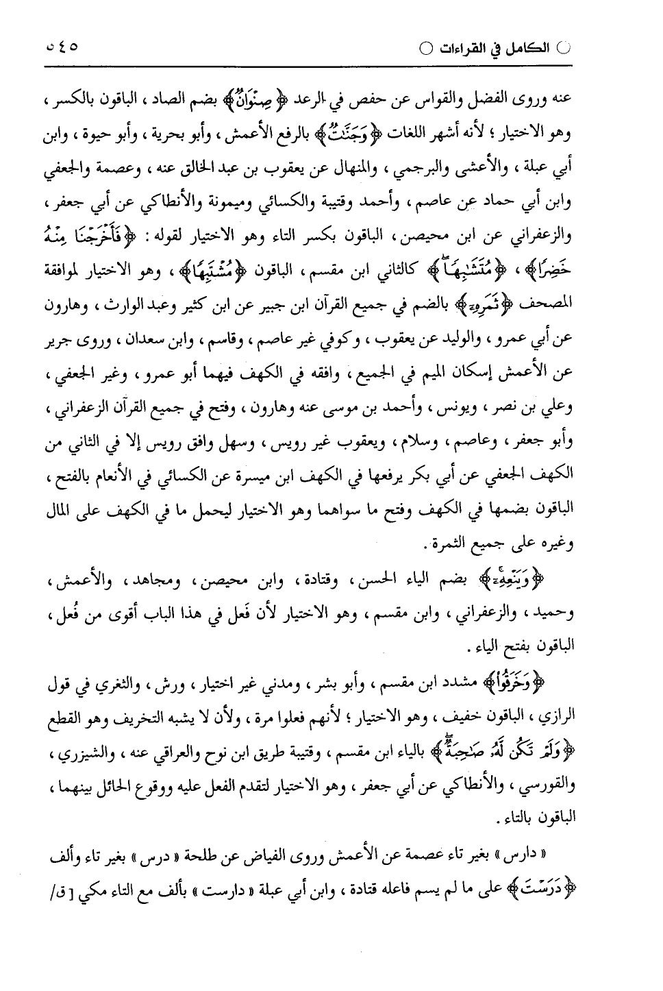 عنه وروى الفضل والقواس عن حفص في الرعد (صِنوَانٌ) بضم الصاد، الباقون بالكسر، وهو الاختيار؛ لأنه أشهر اللغات (وَجَنَّاتٍ) بالرفع الْأَعْمَش، وأبو بحرية، وأبو حيوة، وابن أبي عبلة، والأعشى والبرجمي، والمنهال عن يَعْقُوب بن عبد الخالق عنه، وعصمة والجعفي وابن أبي حماد عن عَاصِم، وأحمد وقُتَيْبَة والكسائي وميمونة والإنطاكي عن أبي جعفر، والزَّعْفَرَانِيّ عن ابن مُحَيْصِن، الباقون بكسر التاء وهو الاختيار لقوله: (فَأَخْرَجْنَا مِنْهُ خَضِرًا)، (مُتَشَابِهًا) كالثاني ابْن مِقْسَمٍ، الباقون (مُشْتَبِهًا)، وهو الاختيار لموافقة المصحف (ثَمَرِة) بالضم في جميع القرآن ابن جبير عن ابْن كَثِيرٍ وعبد الوارث، وهارون عن أَبِي عَمْرٍو، والوليد عن يَعْقُوب، وكوفي غير عَاصِم، وقاسم، وابْن سَعْدَانَ، وروى جرير عن الْأَعْمَش إسكان الميم في الجميع، وافقه في الكهف فيهما أَبُو عَمْرٍو، وغير الجعفي، وعلي بن نصر، ويونس، وأحمد بن موسى عنه وهارون، وفتح في جميع القرآن الزَّعْفَرَانِيّ، وأبو جعفر، وعَاصِم، وسلام، ويَعْقُوب غير رُوَيْس، وسهل وافق رُوَيْس إلا في الثاني من الكهف الجعفي عن أبي بكر يرفعها في الكهف ابن ميسرة عن الكسائي في الأنعام بالفتح، الباقون بضمها في الكهف وفتح ما سواهما وهو الاختيار ليحمل ما في الكهف على المال وغيره على جميع الثمرة.