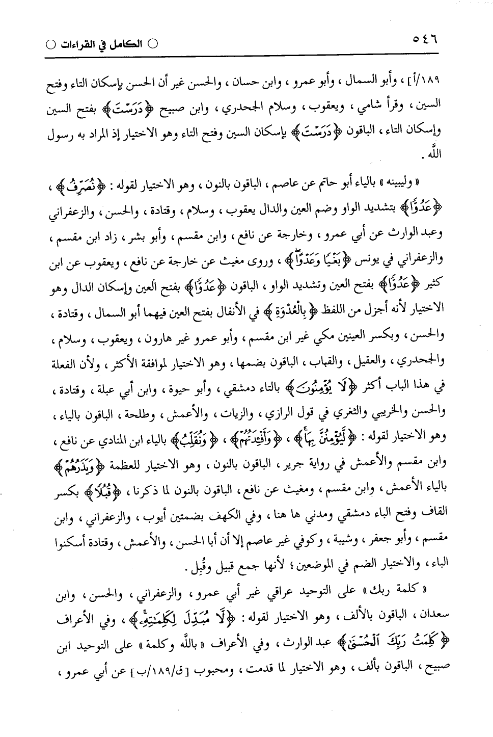 " وليبينه، بالياء أَبُو حَاتِمٍ عن عَاصِم، الباقون بالنون، وهو الاختيار لقوله: (نُصَرِّفُ)، (عَدْوًا) بتشديد الواو وضم العين والدال يَعْقُوب، وسلام، وقَتَادَة، والحسن، والزَّعْفَرَانِيّ وعبد الوارث عن أَبِي عَمْرٍو، وخارجة عن نافع، وابْن مِقْسَمٍ، وأبو بشر، زاد ابْن مِقْسَمٍ، والزَّعْفَرَانِيّ في يونس (بَغْيًا وَعَدْوًا)، وروى مغيث عن خارجة عن نافع، ويَعْقُوب عن ابن كثير (عَدُوًّا) بفتح العين وتشديد الواو، الباقون (عَدْوًا) بفتح العين وإسكان الدال وهو الاختيار لأنه أجزل من اللفظ (بِالْعُدْوَةِ) في الأنفال بفتح العين فيهما أبو السَّمَّال، وقَتَادَة، والحسن، وبكسر العينين مكي غير ابْن مِقْسَمٍ، وأَبُو عَمْرٍو غير هارون، ويَعْقُوب، وسلام، والْجَحْدَرِيّ، والعقيل، والقباب، الباقون بضمها، وهو الاختيار لموافقة الأكثر، ولأن الفعلة في هذا الباب أكثر (لَا يُؤْمِنُون) بالتاء دمشقي، وأبو حيوة، وابن أبي عبلة، وقَتَادَة، والحسن والْخُرَيْبِيّ والثغري في قول الرَّازِيّ، والزَّيَّات، والْأَعْمَش، وطَلْحَة، الباقون بالياء، وهو الاختيار لقوله: (لَيُؤْمِنُنَّ بِهَا)، (أَفْئِدَتَهُمْ)، (وَنُقَلِّبُ) بالياء ابن المنادى عن نافع، وابْن مِقْسَمٍ والْأَعْمَش في رواية جرير، الباقون بالنون، وهو الاختيار للعظمة (وَيَذَرُهُم) بالياء الْأَعْمَش، وابْن مِقْسَمٍ، ومغيث عن نافع، الباقون بالنون لما ذكرنا، (قُبُلًا) بكسر القاف وفتح الباء دمشقي ومدني ها هنا، وفي الكهف بضمتين أيوب، والزَّعْفَرَانِيّ، وابن مقسم، وأبو جعفر، وشيبة، وكوفي غير عَاصِم إلا أن أبا الحسن، والْأَعْمَش، وقَتَادَة أسكنوا الباء، والاختيار الضم في الموضعين، لأنها جمع قبيل وقُبِل.