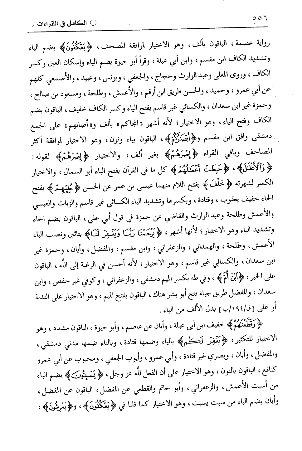 رواية عصمة، الباقون بألف، وهو الاختيار لموافقة المصحف، (يَعْكُفُونَ) بضم الياء وتشديد الكاف ابْن مِقْسَمٍ، وابن أبي عبلة، وقرأ أبو حيوة بضم الياء وإسكان العين وكسر الكاف، وروى الْمُعَلَّى وعبد الوارث وحجاج، والجعفي، ويونس، وعبيد، والأصمعي كلهم عن أَبِي عَمْرٍو، وَحُمَيْد، والحسن طريق ابن أرقم، والْأَعْمَش، وطَلْحَة، ومسعود بن صالح، وحَمْزَة غير ابْن سَعْدَانَ، والكسائي غير قاسم بفتح الياء وكسر الكاف خفيف، الباقون بضم الكاف وفتح الياء، وهو الاختيار؛ لأنه أشهر " أنجاكم " بألف و " أصابهم " على الجمع دمشقي وافق ابْن مِقْسَمٍ و (آصَارَهُمْ)، الباقون بياء ونون، وهو الاختيار لموافقة أكثر المصاحف وباقي القراء (إِصْرَهُمْ) بغير ألف، والاختيار (إِصْرَهُمْ) لقوله: (وَالْأَغْلَالَ)، (حَبِطَتْ أَعْمَالُهُمْ) كل ما في القرآن بفتح الباء أبو السَّمَّال، والاختيار الكسر لشهرته (خَلْفٌ) بفتح اللام منهما عيسى بن عمر عن الحسن (حُلِيِّهِمْ) بفتح الحاء خفيف يَعْقُوب، وقَتَادَة، وبكسرها وتشديد الياء الكسائي غير قاسم والزَّيَّات والْعَبْسِيّ والْأَعْمَش وطَلْحَة وعبد الوارث والقاضي عن حَمْزَة في قول أبي علي، الباقون بضم الحاء وتشديد الياء وهو الاختيار؛ لأنها أشهر، (يَرْحَمْنَا رَبُّنَا وَيَغْفِرْ لَنَا) بتاءين ونصب الباء الْأَعْمَش، وطَلْحَة، والهمداني، والزَّعْفَرَانِيّ، وابْن مِقْسَمٍ، والمفضل، وأبان، وحَمْزَة غير ابْن سَعْدَانَ، والكسائي غير قاسم، وهو الاختيار؛ لأنه أحسن في الرغبة إلى اللَّه، الباقون على الخبر، (ابْنَ أُمَّ)، وفي طه بكسر الميم دمشقي، والزَّعْفَرَانِيّ، وكوفي غير حفص، وابن سعدان، والمفضل طريق جبلة فتح أبو بشر هناك، الباقون بفتح الميم، وهو الاختيار على الندبة أو على بدل الألف من الباء.