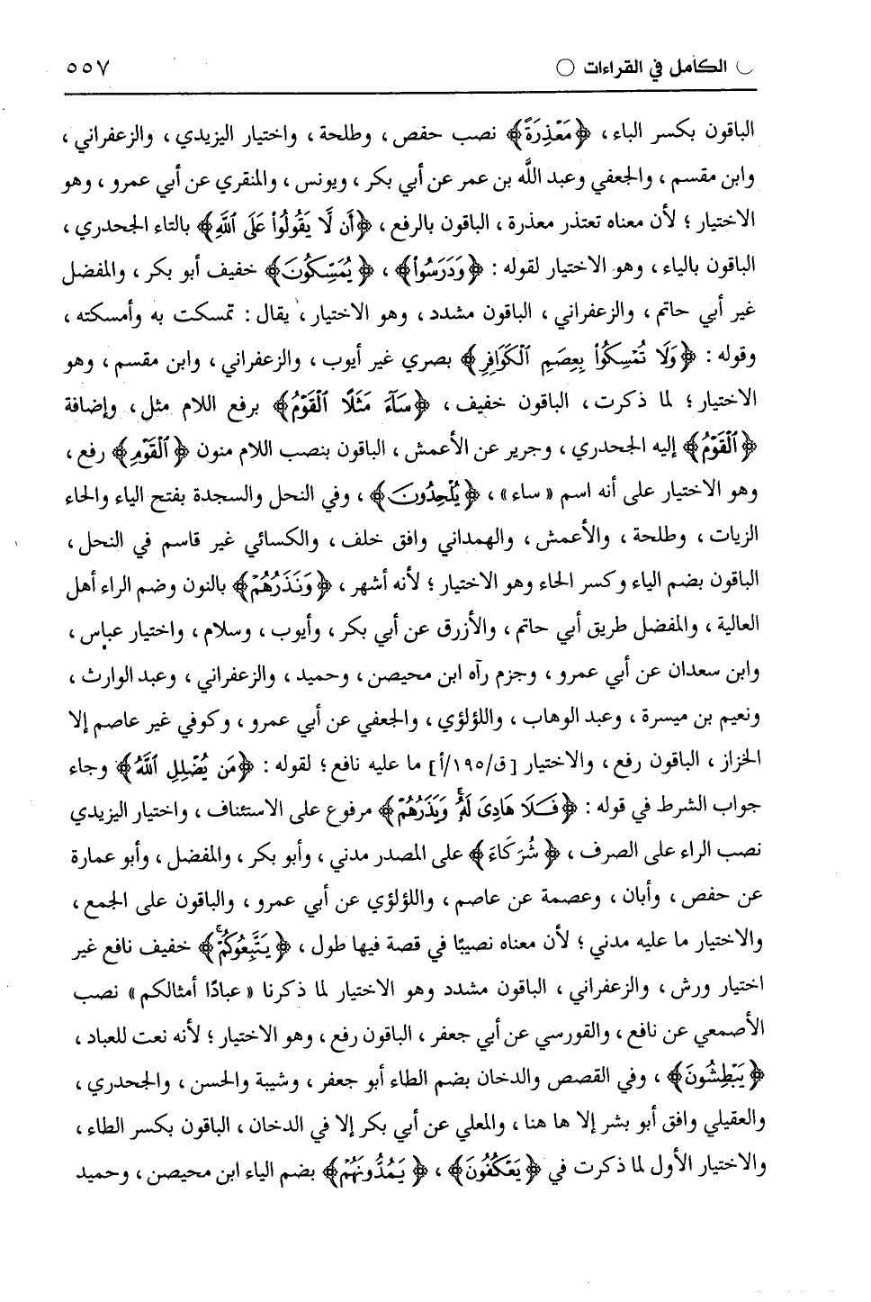 الباقون بكسر الباء، (مَعذِرة) نصب حفص، وطَلْحَة، واختيار الْيَزِيدِيّ، والزَّعْفَرَانِيّ، وابْن مِقْسَمٍ، والجعفي وعبد اللَّه بن عمر عن أبي بكر، ويونس، والمنقري عن أَبِي عَمْرٍو، وهو الاختيار؛ لأن معناه نعتذر معذرة، الباقون بالرفع، (أَنْ لَا يَقُولُوا عَلَى اللَّهِ) بالتاء الْجَحْدَرِيّ، الباقون بالياء، وهو الاختيار لقوله: (وَدَرَسُوا)، (يُمَسِّكُونَ) خفيف أبو بكر، والمفضل غير أبي حاتم، والزَّعْفَرَانِيّ، الباقون مشدد، وهو الاختيار، يقال: تمسكت به وأمسكته، وقوله: (وَلَا تُمْسِكُوا بِعِصَمِ الْكَوَافِرِ) بصري غير أيوب، والزَّعْفَرَانِيّ، وابْن مِقْسَمٍ، وهو الاختيار؛ لما ذكرت، الباقون خفيف، (سَاءَ مَثَلًا الْقَوْمُ) برفع اللام مثل، وإضافة (الْقَوْم) إليه الْجَحْدَرِيّ، وجرير عن الْأَعْمَش، الباقون بنصب اللام منون (الْقَوْمُ) رفع، وهو الاختيار على أنه اسم " ساء "، (يُلْحِدُونَ)، وفي النحل والسجدة بفتح الياء والحاء الزَّيَّات، وطَلْحَة، والْأَعْمَش، والهمداني وافق خلف، والكسائي غير قاسم في النحل، الباقون بضم الياء وكسر الحاء وهو الاختيار؛ لأنه أشهر، (وَنَذَرُهُمْ) بالنون وضم الراء أهل العالية، والمفضل طريق أبي حاتم، والأزرق عن أبي بكر، وأيوب، وسلام، واختيار عباس، وابْن سَعْدَانَ عن أَبِي عَمْرٍو، وجزم رآه ابن مُحَيْصِن، وَحُمَيْد، والزَّعْفَرَانِيّ، وعبد الوارث، ونعيم بن ميسرة، وعبد الوهاب، واللؤلؤي، والجعفي عن أَبِي عَمْرٍو، وكوفي غير عَاصِم إلا الخزاز، الباقون رفع، والاختيار ما عليه نافع؛ لقوله: (مَنْ يُضْلِلِ اللَّهُ) وجاء جواب الشرط في قوله: (فَلَا هَادِيَ لَهُ وَيَذَرُهُمْ) مرفوع على الاستئناف، واختيار الْيَزِيدِيّ نصب الراء على الصرف، (شِرَكًا) على المصدر مدني، وأبو بكر، والمفضل، وأبو عمارة عن حفص، وأبان، وعصمة عن عَاصِم، واللؤلؤي عن أَبِي عَمْرٍو، والباقون على الجمع، والاختيار ما عليه مدني؛ لأن معناه نصيبا في قصة فيها طول، (يَتَّبِعُوكُمْ) خفيف نافع غير اختيار ورش، والزَّعْفَرَانِيّ، الباقون مشدد وهو الاختيار لما ذكرنا " عبادًا أمثالكم " نصب الأصمعي عن نافع، والقورسي عن أبي جعفر، الباقون رفع، وهو الاختيار؛ لأنه نعت للعباد، (يَبْطِشُونَ)، وفي القصص والدخان بضم الطاء أبو جعفر، وشيبة والحسن، والْجَحْدَرِيّ، والعقيلي وافق أبو بشر إلا ها هنا، والْمُعَلَّى عن أبي بكر إلا في الدخان، الباقون بكسر الطاء، والاختيار الأول لما ذكرت في (يَعْكُفُونَ)، (يَمُدُّونَهُمْ) بضم الياء ابن مُحَيْصِن، وحميد