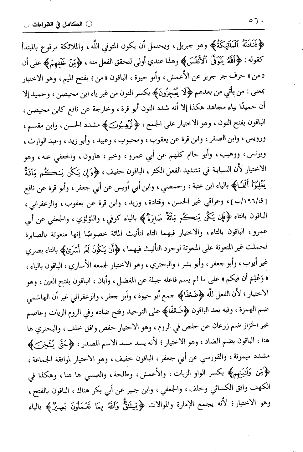 (فَنَادَتْهُ الْمَلَائِكَةُ) وهو جريل، ويحتمل أن يكون المتوفي اللَّه، والملائكة مرفوع بالمبتدأ كقوله: (اللَّهُ يَتَوَفَّى الْأَنْفُسَ) وهذا عندي أولى لتحقق الفعل منه، (مِنْ خَلْفِهِمْ) على أن " مِن " حرف جر جرير عن الْأَعْمَش، وأبو حيوة، الباقون " مَن " بفتح الميم، وهو الاختيار بمعنى: من يأتي من بعدهم (لَا يُعْجِزُونَ) بكسر النون من غير ياء ابن مُحَيْصِن، وَحُمَيْد إلا أن حميدًا بياء مجاهد هكذا إلا أنه شدد النون أبو قرة، وخارجة عن نافع كابن مُحَيْصِن، الباقون بفتح النون، وهو الاختيار على الجمع، (تُرْهِبُونَ) مشدد الحسن، وابْن مِقْسَمٍ، ورُوَيْس، وابن الصقر، وابْن قُرَّةَ عن يَعْقُوب، ومحبوب، وعبيد، وأبو زيد، وعبد الوارث، ويونس، ووهيب، وأَبُو حَاتِمٍ كلهم عن أَبِي عَمْرٍو، وخير، هارون، والجعفي عنه، وهو الاختيار لأن السبابة في تشديد الفعل الكثر، الباقون خفيف، (وَإِنْ يَكُنْ مِنْكُمْ مِائَةٌ يَغْلِبُوا أَلْفًا) بالياء ابن عتبة، وحمصي، وابن أبي أويس عن أبي جعفر، وأبو قرة عن نافع، وعراقي غير الحسن، وقَتَادَة، وزيد، وابْن قُرَّةَ عن يَعْقُوب، والزَّعْفَرَانِيّ، الباقون بالتاء (فَإِنْ يَكُنْ مِنْكُمْ مِائَةٌ صَابِرَةٌ) بالياء كوفي، واللؤلؤي، والجعفي عن أبي عمرو، الباقون بالتاء، والاختيار فيهما التاء لتأنيث المائة خصوصًا إنها منعوتة بالصابرة فحملت غير المنعوتة على المنعوتة لوجود التأنيث فيهما، (أَنْ يَكُونَ لَهُ أَسْرَى) بالتاء بصري غير أيوب، وأبو جعفر، وأبو بشر، والبحتري، وهو الاختيار لجمعه الأساري، الباقون بالياء، " وَعُلِمَ أنَّ فيكم " على ما لم يسم فاعله جبلة عن المفضل، وأبان، الباقون بفتح العين، وهو الاختيار؛ لأن الفعل للَّه (ضعفاء) جمع أبو حيوة، وأبو جعفر، والزَّعْفَرَانِيّ غير أن الهاشمي ضم الهمزة، وفيه بعد، الباقون (ضَعْفًا) على التوحيد وفتح ضاده وفي الروم الزَّيَّات وعَاصِم غير الخزاز ضم زرعان عن حفص في الروم، وهو الاختيار حفص وافق خلف، والبحتري ها هنا، الباقون بضم الضاد، وهو الاختيار؛ لأنه يسد مسد الاسم المصدر، (حَتَّى يُثْخِنَ) مشدد ميمونة، والقورسي عن أبي جعفر، الباقون خفيف، وهو الاختيار لموافقة الجماعة، (مِنْ وَلَايَتِهِمْ) بكسر الواو الزَّيَّات، والْأَعْمَش، وطَلْحَة، والْعَبْسِيّ ها هنا، وهكذا في الكهف وافق الكسائي وخلف، والجعفي، وابن جبير عن أبي بكر هناك، الباقون بالفتح، وهو الاختيار، لأنه يجمع الإمارة والموالات (مِيثَاقٌ وَاللَّهُ بِمَا تَعْمَلُونَ بَصِيرٌ) بالياء