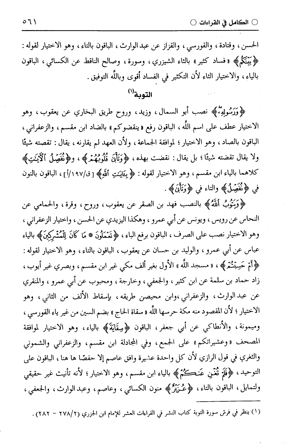 (وَيَتُوبُ اللَّهُ) بالنصب فهد بن الصقر عن يَعْقُوب، وَرَوْحٌ، وقرة، والْحَمَّامِيّ عن النحاس عن رُوَيْس، ويونس عن أَبِي عَمْرٍو، وهكذا الْيَزِيدِيّ عن الحسن، واختيار الزَّعْفَرَانِيّ، وهو الاختيار نصب على الصرف، الباقون برفع الباء، (تَعْمَلُونَ مَا كَانَ لِلْمُشْرِكِينَ) بالياء عباس عن أَبِي عَمْرٍو، والوليد بن حسان عن يَعْقُوب، الباقون بالتاء، وهو الاختيار لقوله: (أَمْ حَسِبْتُمْ)، " مسجد اللَّه " الأول بغير ألف مكي غير ابْن مِقْسَمٍ، وبصري غير أيوب، زاد حماد بن سلمة عن ابْن كَثِيرٍ، والجعفي، وخارجة، ومحبوب عن أَبِي عَمْرٍو، والمنقري عن عبد الوارث، والزَّعْفَرَانِيّ، وابن مُحَيْصِن طريقه، بإسقاط الألف من الثاني، وهو الاختيار؛ لأن المقصود منه مكة حرسها اللَّه " سُقاة الحاج " بضم السين من غير ياء القورسي، وميمونة، والإنطاكي عن أبي جعفر، الباقون (سِقَايَةَ) بالياء، وهو الاختيار لموافقة المصحف " وعشيراتكم " على الجمع، وفي المجادلة ابْن مِقْسَمٍ، والزَّعْفَرَانِيّ والشموني والثغري في قول الرَّازِيّ لأن كل واحدة في بهيرة وافق عَاصِم إلا حفصًا ها هنا، الباقون على التوحيد، (فَلَمْ تُغْنِ عَنْكُمْ) بالياء ابْن مِقْسَمٍ، وهو الاختيار؛ لأنه تأنيث غير حقيقي [وللحائل] (¬1)، الباقون بالتاء، (عُزَيْرٌ) منون الكسائي، وعَاصِم، وعبد الوارث، والجعفي،