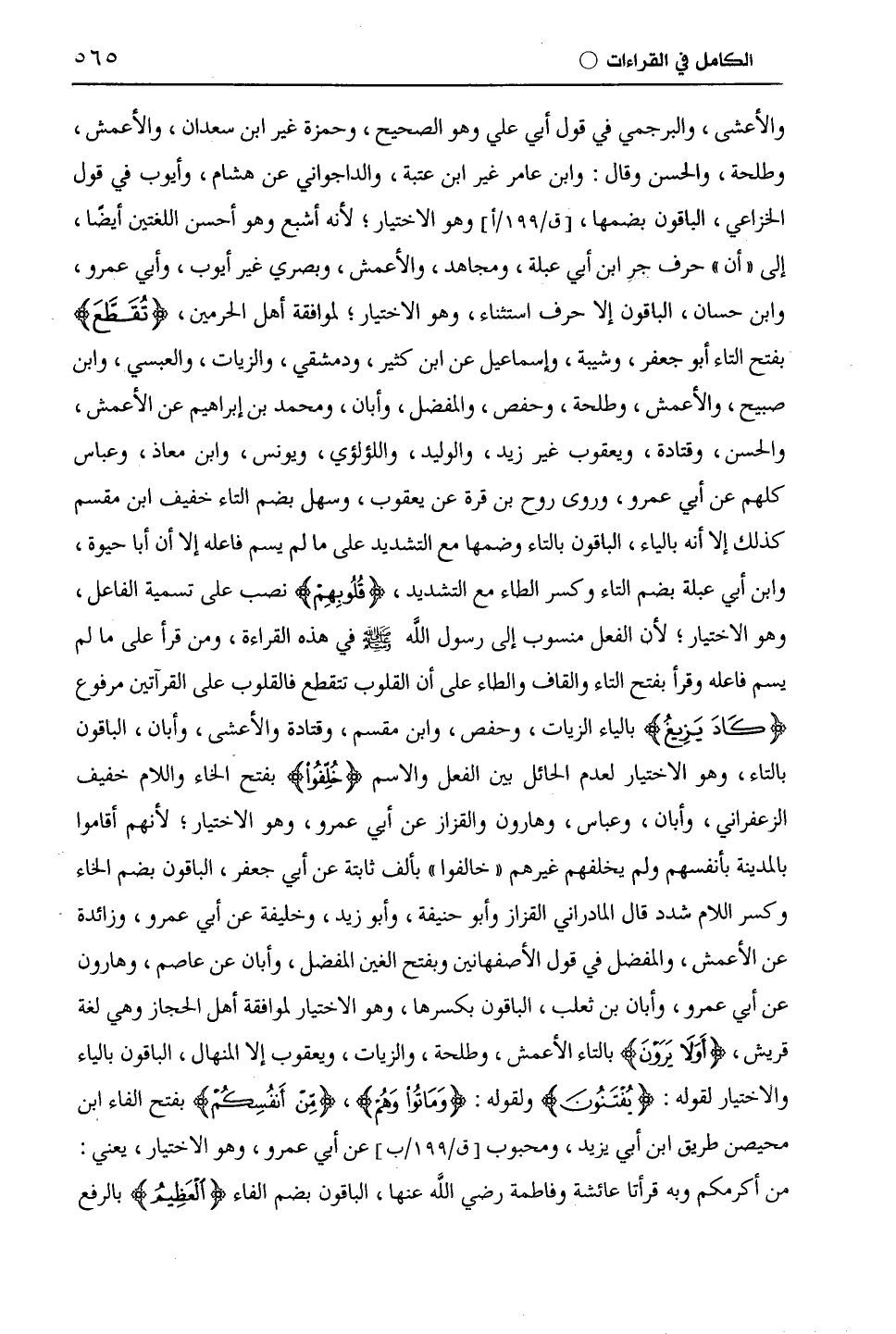 والأعشى، والبرجمي في قول أبي علي وهو الصحيح، وحَمْزَة غير ابْن سَعْدَانَ، والْأَعْمَش، وطَلْحَة، والحسن وقال: وابن عامر غير ابن عتبة، والدَّاجُونِيّ عن هشام، وأيوب في قول الْخُزَاعِيّ، الباقون بضمها، وهو الاختيار؛ لأنه أشبع وهو أحسن اللغتين أيضًا، إلى " أن " حرف جر ابن أبي عبلة، ومجاهد، والْأَعْمَش، وبصري غير أيوب، وأَبِي عَمْرٍو، وابن حسان، الباقون إلا حرف استثناء، وهو الاختيار، لموافقة أهل الحرمين، (تَقَطَّعَ) بفتح التاء أبو جعفر، وشيبة، وإسماعيل عن ابْن كَثِيرٍ، ودمشقي، والزَّيَّات، والْعَبْسِيّ، وابن صبيح، والْأَعْمَش، وطَلْحَة، وحفص، والمفضل، وأبان، ومحمد بن إبراهيم عن الْأَعْمَش، والحسن، وقَتَادَة، ويَعْقُوب غير زيد، والوليد، واللؤلؤي، ويونس، وابن معاذ، وعباس كلهم عن أَبِي عَمْرٍو، وروى روح بْن قُرَّةَ عن يَعْقُوب، وسهل بضم التاء خفيف ابْن مِقْسَمٍ كذلك إلا أنه بالياء، الباقون بالتاء وضمها مع التشديد على ما لم يسم فاعله إلا أن أبا حيوة، وابن أبي عبلة بضم التاء وكسر الطاء مع التشديد، (قُلُوبَهُم) نصب على تسمية الفاعل، وهو الاختيار، لأن الفعل منسوب إلى رسول اللَّه - صلى الله عليه وسلم - في هذه القراءة، ومن قرأ على ما لم يسم فاعله وقرأ بفتح التاء والقاف والطاء على أن القلوب تتقطع فالقلوب على القراءتين مرفوع (كَادَ يَزِيغُ) بالياء الزَّيَّات، وحفص، وابْن مِقْسَمٍ، وقَتَادَة والأعشى، وأبان، الباقون بالتاء، وهو الاختيار لعدم الحائل بين الفعل والاسم (خُلِّفُوا) بفتح الخاء واللام خفيف الزَّعْفَرَانِيّ، وأبان، وعباس، وهارون والقزاز عن أَبِي عَمْرٍو، وهو الاختيار؛ لأنهم أقاموا بالمدينة بأنفسهم ولم يخلفهم غيرهم " خالفوا " بألف ثابتة عن أبي جعفر، الباقون بضم الخاء وكسر اللام شدد قال الأدراني القزاز وأبو حنيفة، وأبو زيد، وخليفة عن أَبِي عَمْرٍو، وزائدة عن الأعشى، والمفضل في قول الْأَصْفَهَانِيّن وبفتح الغين المفضل، وأبان عن عَاصِم، وهارون عن أَبِي عَمْرٍو، وأبان بن ثعلب، الباقون بكسرها، وهو الاختيار لموافقة أهل الحجاز وهي لغة قريش، (أَوَلَا يَرَونَ) بالتاء الْأَعْمَش، وطَلْحَة، والزَّيَّات، ويَعْقُوب إلا المنهال، الباقون بالياء والاختيار لقوله: (يُفتَنُونَ) ولقوله: (وَمَاتُوا وَهُمْ)، (مِنْ أَنْفُسِكُمْ) بفتح الفاء ابن مُحَيْصِن طريق ابن أبي يزيد، ومحبوب عن أَبِي عَمْرٍو، وهو الاختيار، يعني: من أكرمكم وبه قَرَأَتْ عائشة وفاطمة رضي اللَّه عنها، الباقون بضم الفاء (الْعَظِيمُ) بالرفع