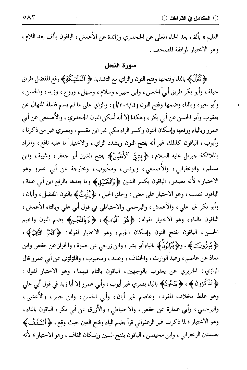 (تَنَزَّلُ) بالتاء وفتحها وفتح النون والزاي مع التشديد (الْمَلَائِكَةُ) رفع المفضل طريق جبلة، وأبو بكر طريق أبي الحسن، وابن جبير، وسلام، وسهل، وَرَوْحٌ، وزيد، والحسن، وأبو حيوة وبالتاء وضمها وفتح النون، والزاي على ما لم يسم فاعله المنهال عن يَعْقُوب وأبو الحسن عن أبي بكر، وهكذا إلا أنه أسكن النون الْجَحْدَرِيّ، والأصمعي عن أبي عمرو وبالياء ورفعها وإسكان النون وكسر الزاء مكي غير ابْن مِقْسَمٍ، وبصري غير من ذكرنا، وأيوب، الباقون كذلك غير أنه بفتح النون ويشدد الزاي، والاختيار ما عليه نافع، والمراد بالملائكة جبريل عليه السلام، (بِشِقِّ الْأَنْفُسِ) بفتح الشين أبو جعفر، وشيبة، وابن مسلم، والزَّعْفَرَانِيّ، والأصمعي، ويونس، ومحبوب، وخارجة عن أَبِي عَمْرٍو وهو الاختيار، لأنه مصدر، الباقون بكسر الشين (وَالْخَيْلَ) وما بعدها بالرفع ابن أبي عبلة، الباقون نصب، وهو الاختيار على معنى: وخلق الخيل، (يُنْبِتُ) بالنون المفضل، وأبان، وأبو بكر غير علي، والْأَعْمَش، والبرجمي والاحتياطي في قول أبي علي وبالتاء الْأَعْمَش، الباقون بالياء، وهو الاختيار لقوله: (هُوَ الَّذِي)، (وَبِالنَّجْمِ) بضم النون والجيم الحسن، الباقون بفتح النون وإسكان الجيم، وهو الاختيار لقوله: (النَّجْمُ الثَّاقِبُ)، (يُسِرُّونَ)، و (يُعْلِنُونَ) بالياء أبو بشر، وابن زرحي عن حَمْزَة، والخزاز عن حفص وابن معاذ عن عَاصِم، وعبد الوارث، والخفاف، وعبيد، ومحبوب، واللؤلؤي عن أَبِي عَمْرٍو قال الرَّازِيّ: الجريري عن يَعْقُوب بالوجهين، الباقون بالتاء فيهما، وهو الاختيار لقوله: (تَذَكَّرُونَ)، (يَدْعُونَ) بالباء بصري غير أيوب، وأَبِي عَمْرٍو إلا أبا زيد في قول أبي علي وهو غلط بخلاف المفرد، وعَاصِم غير أبان، وأبي الحسن، وابن جبير، والأعشى، والبرجمي، وأبي عمارة عن حفص، والاحتياطي، والأزرق عن أبي بكر، الباقون بالتاء، وهو الاختيار، لما ذكرت غير الزَّعْفَرَانِيّ قرأ بضم الياء وفتح العين حيث وقع، (السَّقْفُ) بضمتين الزَّعْفَرَانِيّ، وابن مُحَيْصِن، الباقون بفتح السين وإسكان القاف، وهو الاختيار؛ لأنه
