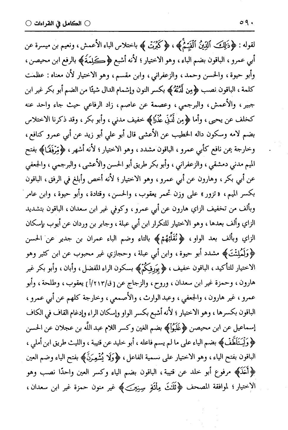 لقوله: (ذَلِكَ الدِّينُ الْقَيِّمُ)، (كَبُرَتْ) باختلاس الباء الْأَعْمَش، ونعيم بن ميسرة عن أَبِي عَمْرٍو، الباقون بضم الباء، وهو الاختيار؛ لأنه أشبع (كَلِمَةً) بالرفع ابن مُحَيْصِن، وأبو حيوة، والحسن وحمد، والزَّعْفَرَانِيّ، وابْن مِقْسَمٍ، وهو الاختيار لأن معناه: عظمت كلمة، الباقون نصب (مِنْ لَدُنْهُ) بكسر النون وإشمام الدال شيئًا من الضم أبو بكر غير ابن جبير، والْأَعْمَش، والبرجمي، وعصمة عن عَاصِم، زاد الرفاعي صا جاء واحد عنه كخلف عن يحيى، وأما (مِنْ لَدُنِّي عُذْرًا) خفيف مدني، وأبو بكر، وقد ذكرنا الاختلاس بضم لامه وسكون داله الخطيب عن الأعشى قال أبو علي أبو زيد عن أَبِي عَمْرٍو كنافع، وخارجة عن نافع كأَبِي عَمْرٍو، الباقون مشدد، وهو الاختيار؛ لأنه أشهر، (مِرفَقًا) بفتح الميم مدني دمشقي، والزَّعْفَرَانِيّ، وأبو بكر طريق أبو الحسن والأعشى، والبرجمي، والجعفي عن أبي بكر، وهارون عن أَبِي عَمْرٍو، وهو الاختيار؛ لأنه أخص وأبلغ في الرفق، الباقون بكسر الميم، (تَزْوَرُّ) على وزن تَحْمَرُّ يَعْقُوب، والحسن، وقَتَادَة، وأبو حيوة، وابن عامر وبألف من تخفيف الزاي هارون عن أَبِي عَمْرٍو، وكوفي غير ابْن سَعْدَانَ، الباقون بتشديد الزاي وألف بعدها، وهو الاختيار للتكرار ابن أبي عبلة، وجابر بن وردان عن أيوب باسكان الزاي وبألف بعد الواو، (وَنُقَلِّبُهُمْ) بالتاء وضم الباء عمران بن جدير عن الحسن (وَلَمُلِئْتَ) مشدد أبو حيوة، وابن أبي عبلة، وحجازي غير محبوب عن ابْن كَثِيرٍ وهو الاختيار للتأكيد، الباقون خفيف، (بِوَرِقِكُمْ) بسكون الراء المفضل، وأبان، وأبو بكر غير هارون، وحَمْزَة غير ابْن سَعْدَانَ، وَرَوْحٌ، والزجاج عن يَعْقُوب، وطَلْحَة، وأبو عمرو، غير هارون، والجعفي، وعبد الوارث، والأصمعي، وخارجة كلهم عن أَبِي عَمْرٍو، الباقون بكسرها، وهو الاختيار؛ لأنه أشبع بكسر الواو وإسكان الراء وإدغام القاف في الكاف إسماعيل عن ابن مُحَيْصِن (غَلَبُوا) بضم الغين وكسر اللام عبد اللَّه بن عجلان عن الحسن (وَلْيَتَلَطَّفْ) بضم الياء على ما لم يسم فاعله، أبو خليد عن قُتَيْبَة، والليث طريق ابن أملي، الباقون بفتح الياء، وهو الاختيار على تسمية الفاعل، (وَلَا يُشْعِرَنَّ) بفتح الياء وضم العين (أَحَدًا) مرفوع أبو خلد عن قُتَيْبَة، الباقون بضم الياء وكسر العين واحدًا نصب وهو الاختيار؛ لموافقة المصحف (ثَلَاثَ مِائَةٍ سِنِينَ) غير منون حَمْزَة غير ابْن سَعْدَانَ،