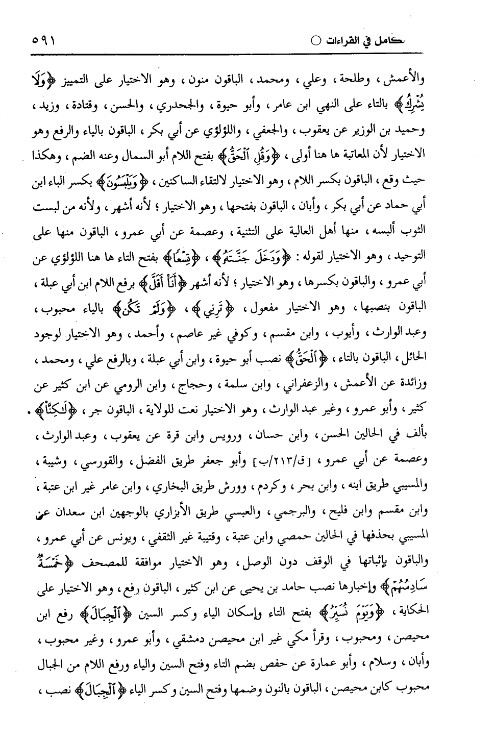 والْأَعْمَش، وطَلْحَة، وعلي، ومحمد، الباقون منون، وهو الاختيار على التمييز (وَلَا يُشْرِكُ) بالتاء على النهي ابن عامر، وأبو حيوة، والْجَحْدَرِيّ، والحسن، وقَتَادَة، وزيد، وَحُمَيْد بن الوزير عن يَعْقُوب، والجعفي، واللؤلؤي عن أبي بكر، الباقون بالياء والرفع وهو الاختيار لأن المعاتبة ها هنا أولى، (وَقُلِ الْحَقُّ) بفتح اللام أبو السَّمَّال وعنه الضم، وهكذا حيث وقع، الباقون بكسر اللام، وهو الاختيار لالتقاء الساكنين، (وَيَلْبَسُونَ) بكسر الباء ابن أبي حماد عن أبي بكر، وأبان، الباقون بفتحها، وهو الاختيار؛ لأنه أشهر، ولأنه من لبست الثوب ألبسه، منها أهل العالية على التثنية، وعصمة عن أَبِي عَمْرٍو، الباقون منها على التوحيد، وهو الاختيار لقوله: (وَدَخَلَ جَنَّتَهُ)، (تِسْعًا) بفتح التاء ها هنا اللؤلؤي عن أَبِي عَمْرٍو، والباقون بكسرها، وهو الاختيار؛ لأنه أشهر (أَنَاْ أَقَلُّ) برفع اللام ابن أبي عبلة، الباقون بنصبها، وهو الاختيار مفعول، (تَرِني)، (وَلَم تَكُن) بالياء محبوب، وعبد الوارث، وأيوب، وابْن مِقْسَمٍ، وكوفي غير عَاصِم، وأحمد، وهو الاختيار لوجود الحائل، الباقون بالتاء، (الْحَقُّ) نصب أبو حيوة، وابن أبي عبلة، وبالرفع علي، ومحمد، وزائدة عن الْأَعْمَش، والزَّعْفَرَانِيّ، وابن سلمة، وحجاج، وابن الرومي عن ابْن كَثِيرٍ عن كثير، وأَبُو عَمْرٍو، وغير عبد الوارث، وهو الاختيار نعت للولاية، الباقون جر، (لَكِنَّا) بألف في الحالين الحسن، وابن حسان، ورُوَيْس وابْن قُرَّةَ عن يَعْقُوب، وعبد الوارث، وعصمة عن أَبِي عَمْرٍو، وأبو جعفر طريق الفضل، والقورسي، وشيبة، والْمُسَيَّبِيّ طريق ابنه، وابن بحر، وكردم، وورش طريق البخاري، وابن عامر غير ابن عتبة، وابْن مِقْسَمٍ وابْن فُلَيْحٍ، والبرجمي، والْعَبْسِيّ طريق الأبزاري بالوجهين ابْن سَعْدَانَ عن الْمُسَيَّبِيّ بحذفها في الحالين حمصي وابن عتبة، وقُتَيْبَة غير الثقفي، ويونس عن أَبِي عَمْرٍو، والباقون بإثباتها في الوقف دون الوصل، وهو الاختيار موافقة للمصحف (خَمْسَةٌ سَادِسُهُمْ) وإخبارها نصب حامد بن يحيى عن ابْن كَثِيرٍ، الباقون برفع، وهو الاختيار على الحكاية، (نُسَيِّرُ الْجِبَالَ) بفتح التاء وإسكان الياء وكسر السين (الْجِبَالَ) رفع ابن مُحَيْصِن، ومحبوب، وقرأ مكي غير ابن مُحَيْصِن دمشقي، وأَبُو عَمْرٍو، وغير محبوب، وأبان، وسلام، وأبو عمارة عن حفص بضم التاء وفتح السين والياء ورفع اللام من الجبال محبوب كابن مُحَيْصِن، الباقون بالنون وضمها وفتح السين وكسر الياء (الْجِبَالَ) نصب،