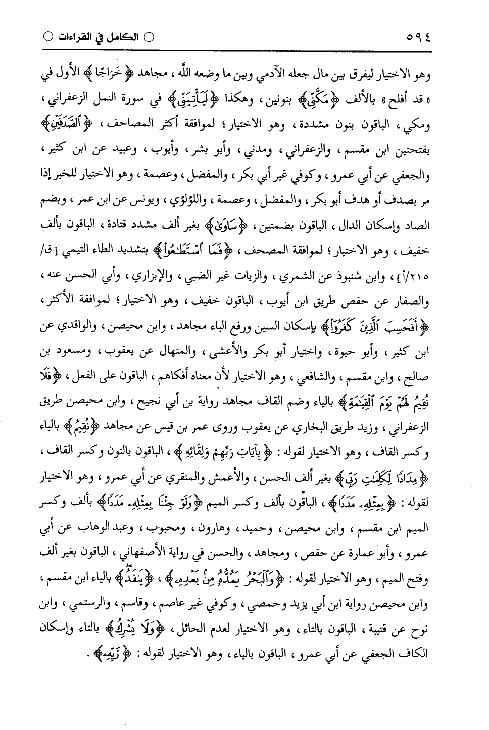 وهو الاختيار ليفرق بين مال جعله الآدمي وبين ما وضعه اللَّه، مجاهد (خَرَاجًا) الأول في " قد أفلح " بالألف (مَكَّنِّي) بنونين، وهكذا (لَيَأْتِيَنِّي) في سورة النمل الزَّعْفَرَانِيّ، ومكي، الباقون بنون مشددة، وهو الاختيار؛ لموافقة أكثر المصاحف، (الصَّدَفَيْنِ) بفتحتين ابْن مِقْسَمٍ، والزَّعْفَرَانِيّ، ومدني، وأبو بشر، وأيوب، وعبيد عن ابْن كَثِيرٍ، والجعفي عن أَبِي عَمْرٍو، وكوفي غير أبي بكر، والمفضل، وعصمة، وهو الاختيار للخبر إذا مر بصدف أو هدف أبو بكر، والمفضل، وعصمة، واللؤلؤي، ويونس عن ابن عمر، وبضم الصاد وإسكان الدال، الباقون بضمتين، (سَاوَى) بغير ألف مشدد قَتَادَة، الباقون بألف خفيف، وهو الاختيار؛ لموافقة المصحف، (فَمَا اسْطَاعُوا) بتشديد الطاء التيمي، وابْن شَنَبُوذَ عن الشمري، والزَّيَّات غير الضبي، والأبزاري، وأبي الحسن عنه، والصفار عن حفص طريق ابن أيوب، الباقون خفيف، وهو الاختيار؛ لموافقة الأكثر، (أَفَحَسِبَ الَّذِينَ كَفَرُوا) بإِسكان السين ورفع الباء مجاهد، وابن مُحَيْصِن، والواقدي عن ابْن كَثِيرٍ، وأبو حيوة، واختيار أبو بكر والأعشى، والمنهال عن يَعْقُوب، ومسعود بن صالح، وابْن مِقْسَمٍ، والشافعي، وهو الاختيار لأن معناه [أفكافيهم]، الباقون على الفعل، (فَلَا نُقِيمُ لَهُمْ يَوْمَ الْقِيَامَةِ) بالياء وضم القاف مجاهد رواية بن أبي نجيح، وابن مُحَيْصِن طريق الزَّعْفَرَانِيّ، وزيد طريق البخاري عن يَعْقُوب وروى عمر بن قيس عن مجاهد (نُقِيمُ) بالياء وكسر القاف، وهو الاختيار لقوله: (بِآيَاتِ رَبِّهِمْ وَلِقَائِهِ)، الباقون بالنون وكسر القاف، (مِدَادًا لِكَلِمَاتِ رَبِّي) بغير ألف الحسن، والْأَعْمَش والمنقري عن أَبِي عَمْرٍو، وهو الاختيار لقوله: (بِمِثْلِهِ مَدَدًا)، الباقون بألف وكسر الميم (وَلَوْ جِئْنَا بِمِثْلِهِ مَدَدًا) بألف وكسر الميم ابْن مِقْسَمٍ، وابن مُحَيْصِن، وَحُمَيْد، وهارون، ومحبوب، وعبد الوهاب عن أبي عمرو، وأبو عمارة عن حقص، ومجاهد، والحسن في رواية الْأَصْفَهَانِيّ، الباقون بغير ألف وفتح الميم، وهو الاختيار لقوله: (وَالْبَحْرُ يَمُدُّهُ مِنْ بَعْدِهِ)، (ينَفَدَ) بالياء ابْن مِقْسَمٍ، وابن مُحَيْصِن رواية ابن أبي يزيد وحمصي، وكوفي غير عَاصِم، وقاسم، والرستمي، وابن نوح عن قُتَيْبَة، الباقون بالتاء، وهو الاختيار لعدم الحائل، (وَلَا يُشْرِكْ) بالتاء وإسكان الكاف الجعفي عن أَبِي عَمْرٍو، الباقون بالياء، وهو الاختيار لقوله: (رَبِّهِ).