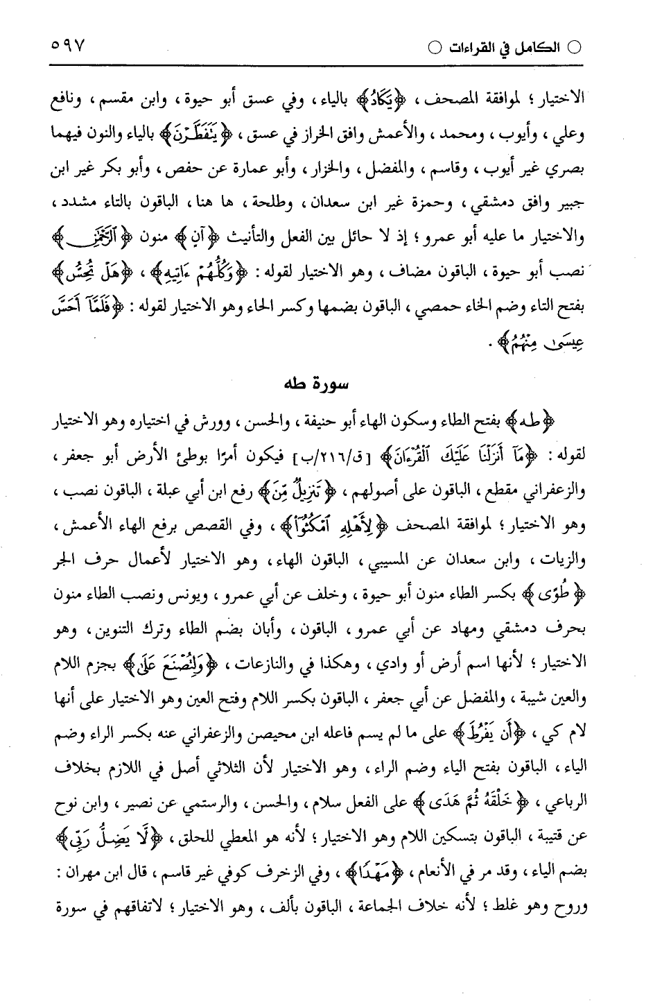 (طه) بفتح الطاء وسكون الهاء أبو حنيقة، والحسن، وورش في اختياره وهو الاختيار لقوله: (مَا أَنْزَلْنَا عَلَيْكَ الْقُرْآنَ لِتَشْقَى)، فيكون أمرًا بوطء الأرض أبو جعفر، والزَّعْفَرَانِيّ مقطع، الباقون على أصولهم، (تَنْزِيلٌ مِمَّنْ) رفع ابن أبي عبلة، الباقون نصب، وهو الاختيار؛ لموافقة المصحف (لِأَهْلِهِ امْكُثُوا)، وفي القصص برفع الهاء الْأَعْمَش، والزَّيَّات، وابْن سَعْدَانَ عن الْمُسَيَّبِيّ، الباقون الهاء، وهو الاختيار لأعمال حرف الجر (طُوًى) بكسر الطاء منون أبو حيوة، وخلف عن أَبِي عَمْرٍو، ويونس ونصب الطاء منون بحرف دمشقي ومهاد عن أَبِي عَمْرٍو، الباقون، وأبان بضم الطاء وترك التنوين، وهو الاختيار؛ لأنها اسم أرض أو وادي، وهكذا في والنازعات، (وَلِتُصْنَعَ عَلَى) بجزم اللام والعين شيبة، والمفضل عن أبي جعفر، الباقون بكسر اللام وفتح العين وهو الاختيار على أنها لام كي، (أَن يَفْرُطَ) على ما لم يسم فاعله ابن مُحَيْصِن والزَّعْفَرَانِيّ عنه بكسر الراء وضم الياء، الباقون بفتح الياء وضم الراء، وهو الاختيار لأن الثلاثي أصل في اللازم بخلاف الرباعي، (خَلْقَهُ ثُمَّ هَدَى) على الفعل سلام، والحسن، والرستمي عن نصير، وابن نوح عن قُتَيْبَة، الباقون بتسكين اللام وهو الاختيار، لأنه هو المعطي للخلق، (لَا يَضِلُّ رَبِّي) بضم الياء، وقد مر في الأنعام، (مَهْدًا)، وفي الزخرف كوفي غير قاسم، قال ابن مهران: وَرَوْحٌ وهو غلط، لأنه خلاف الجماعة، الباقون بألف، وهو الاختيار؛ لاتفاقهم في سورة