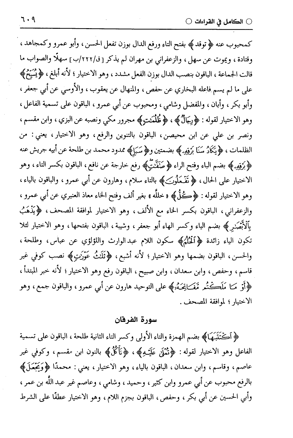 كمحبوب عنه (توقد) بفتح التاء ورفع الدال بوزن تفعل الحسن، وأَبُو عَمْرٍو وكمجاهد، وقَتَادَة، ويموت عن سهل، والزَّعْفَرَانِيّ بن مهران لم يذكر سهلًا والصواب ما قالت الجماعة، الباقون بنصب الدال بوزن الفعل مشدد، وهو الاختيار؛ لأنه أبلغ، (يُسَبَّحُ) على ما لم يسم فاعله البخاري عن حفص، والمنهال عن يَعْقُوب، والأوسي عن أبي جعفر، وأبو بكر، وأبان، والمفضل وشامي، ومحبوب عن أَبِي عَمْرٍو، الباقون على تسمية الفاعل، وهو الاختيار لقوله: (رِجَالٌ)، (ظُلُمَاتٌ) مجرور مكي ونصبه عن البزي، وابْن مِقْسَمٍ، ونصر بن علي عن ابن مُحَيْصِن، الباقون بالتنوين والرفع، وهو الاختيار، يعني: من الظلمات، (يَكَادُ سَنَا بَرْقِهِ) بضمتين و (سَنَاء) ممدود محمد بن طَلْحَة عن أبيه جريش عنه (بَرْقِهِ) بضم الباء وفتح الراء (صَافَّاتٍ) رفع خارجة عن نافع، الباقون بكسر التاء، وهو الاختيار على الحال، (تَفعَلُونَ) بالتاء سلام، وهارون عن أَبِي عَمْرٍو، والباقون بالياء، وهو الاختيار لقوله: (كُلٌّ) (خَلَلِهِ) بغير ألف وفتح الخاء معاذ العنبري عن أَبِي عَمْرٍو، والزَّعْفَرَانِيّ، الباقون بكسر الخاء مع الألف، وهو الاختيار لموافقة المصحف، (يَذْهَبُ بِالْأَبْصَارِ) بضم الياء وكسر الهاء أبو جعفر، وشيبة، الباقون بفتحها، وهو الاختيار لئلا تكون الياء زائدة (الْحُلُمَ) سكون اللام عبد الوارث واللؤلؤي عن عباس، وطَلْحَة، والحسن، الباقون بضمها وهو الاختيار، لأنه أشبع، (ثَلَاثُ عَوْرَاتٍ) نصب كوفي غير قاسم، وحفص، وابْن سَعْدَانَ، وابن صبيح، الباقون رفع وهو الاختيار؛ لأنه خبر المبتدأ، (أَوْ مَا مَلَكْتُمْ مَفَاتِحَهُ) على التوحيد هارون عن أَبِي عَمْرٍو، والباقون جمع، وهو الاختيار؛ لموافقة المصحف.