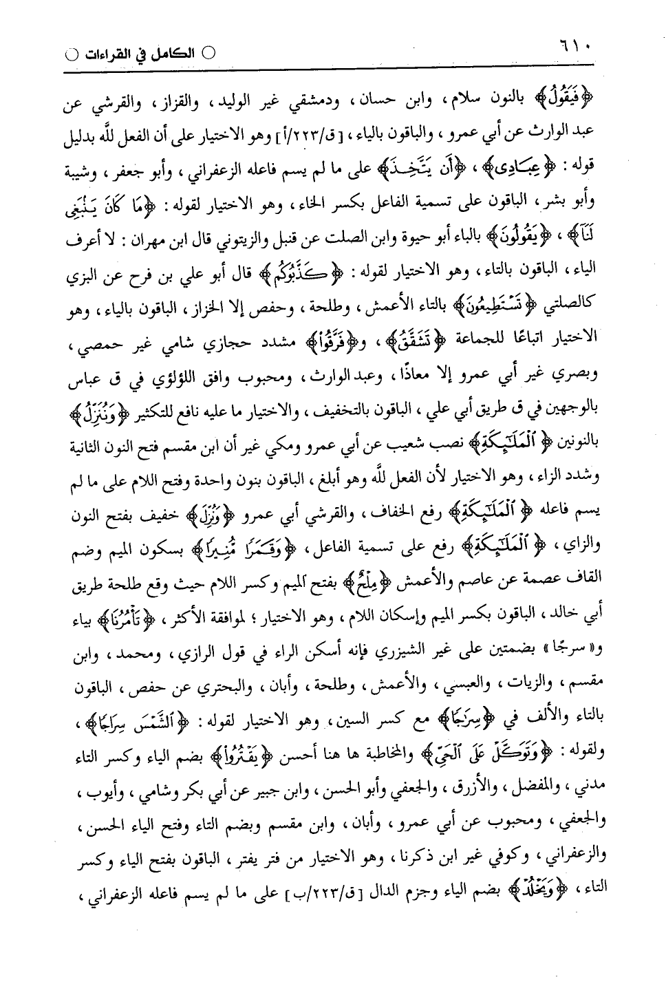 (فَيَقُولُ) بالنون سلام، وابن حسان، ودمشقي غير الوليد، والقزاز، والقرشي عن عبد الوارث عن أَبِي عَمْرٍو، والباقون بالياء، وهو الاختيار على أنه الفعل للٌه بدليل قوله: (عِبَادِي)، (أَنْ نُتَّخَذَ) على ما لم يسم فاعله الزَّعْفَرَانِيّ، وأبو جعفر، وشيبة وأبو بشر، الباقون على تسمية الفاعل بكسر الخاء، وهو الاختيار لقوله: (مَا كَانَ يَنْبَغِي لَنَا)، (يَقولُونَ) بالياء أبو حيوة وابْن الصَّلْتِ عن قُنْبُل والزيتوني قال ابن مهران: لا أعرف الياء، الباقون بالتاء، وهو الاختيار لقوله: (كَذَّبُوكُمْ) قال أبو علي بن فرح عن البزي كالصلتي (تَسْتَطِيعُونَ) بالتاء الْأَعْمَش، وطَلْحَة، وحفص إلا الخزاز، الباقون بالياء، وهو الاختيار اتباعًا للجماعة (تَشَقَّقُ)، [هُنَا، وَفِي ق] مشدد حجازي شامي غير حمصي، وبصري غير أَبِي عَمْرٍو إلا معاذًا، وعبد الوارث، ومحبوب وافق اللؤلؤي في ق عباس بالوجهين في ق طريق أبي علي، الباقون بالتخفيف، والاختيار ما عليه نافع للتكثير (وَنُزِّلَ الْمَلَائِكَةُ) بالنونين (الْمَلَائِكَةَ) نصب شعيب عن أَبِي عَمْرٍو ومكي غير أن ابْن مِقْسَمٍ فتح النون الثانية وشدد الزاء، وهو الاختيار لأن الفعل للَّه وهو أبلغ، الباقون بنون واحدة وفتح اللام على ما لم يسم فاعله (الْمَلَائِكَةُ) رفع الخفاف، والقرشي أَبِي عَمْرٍو (وَنَزَلَ) خفيف بفتح النون والزاي، (الْمَلَائِكَةُ) رفع على تسمية الفاعل، (وَقَمَرًا مُنِيرًا) بسكون الميم وضم القاف عصمة عن عَاصِم والْأَعْمَش (مِلْحٌ) بفتح الميم وكسر اللام حيث وقع طَلْحَة طريق أبي خالد، الباقون بكسر الميم وإسكان اللام، وهو الاختيار؛ لموافقة الأكثر، (لِمَا تَأْمُرُنَا) بياء و " سُرُجًا " بضمتين على غير الشيزري فإنه أسكن الراء في قول الرَّازِيّ، ومحمد، وابن مقسم، والزَّيَّات، والْعَبْسِيّ، والْأَعْمَش، وطَلْحَة، وأبان، والبحتري عن حفص، الباقون بالتاء والألف في (سِرَاجًا) مع كسر السين، وهو الاختيار لقوله: (الشَّمْسَ سِرَاجًا)، ولقوله: (وَتَوَكَّلْ عَلَى الْحَيِّ) والمخاطبة ها هنا أحسن (يَقْتُرُوا) بضم الياء وكسر التاء مدني، والمفضل، والأزرق، والجعفي وأبو الحسن، وابن جبير عن أبي بكر وشامي، وأيوب، والجعفي، ومحبوب عن أَبِي عَمْرٍو، وأبان، وابْن مِقْسَمٍ وبضم التاء وفتح الياء الحسن، والزَّعْفَرَانِيّ، وكوفي غير ابن زروان، وهو الاختيار من فتر يفتر، الباقون بفتح الياء وكسر التاء، (وَيَخْلُدْ) بضم الياء وجزم الدال على ما لم يسم فاعله الزَّعْفَرَانِيّ،