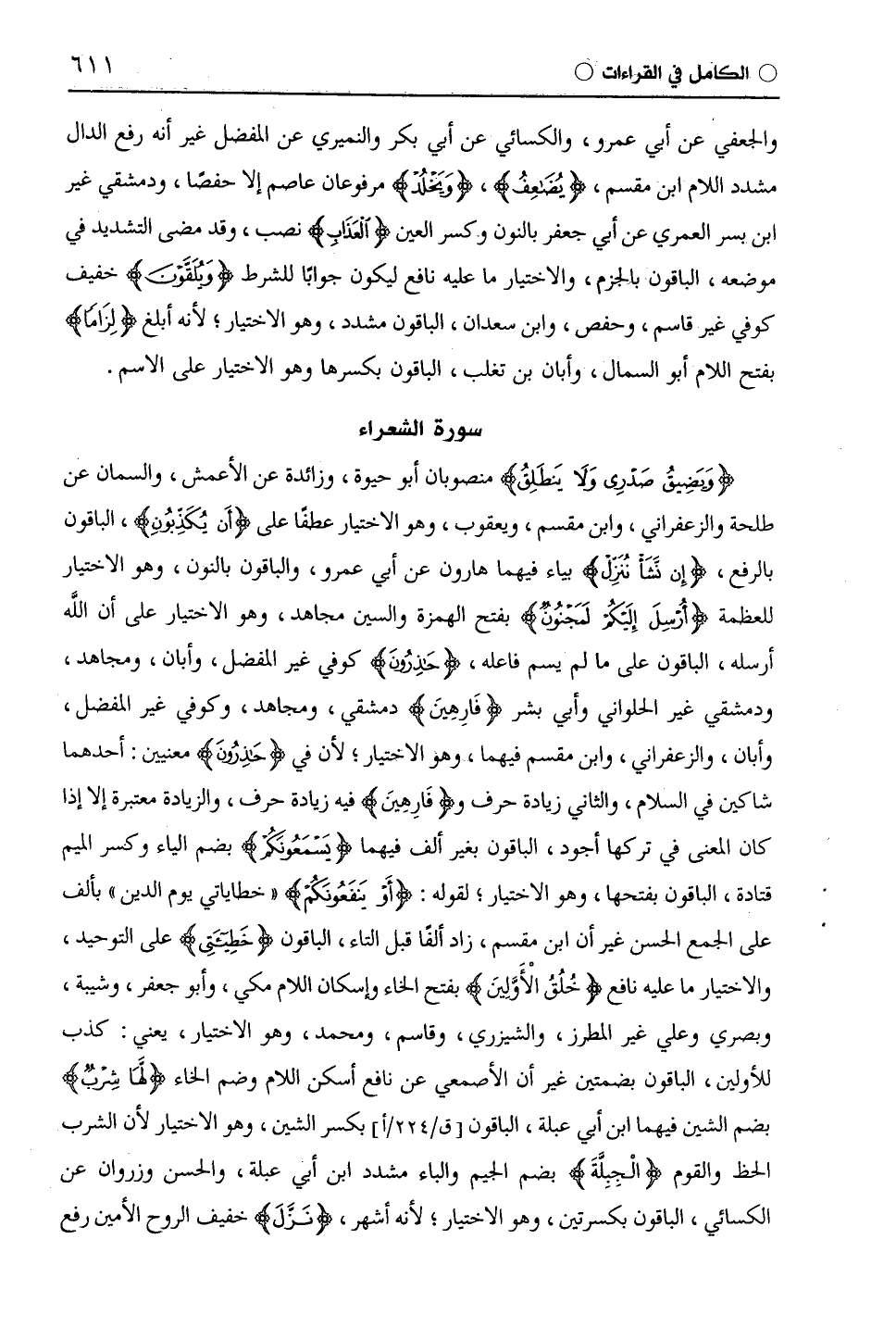 (وَيَضِيقُ صَدْرِي وَلَا يَنْطَلِقُ) منصوبان أبو حيوة، وزائدة عن الْأَعْمَش، والسمان عن طَلْحَة والزَّعْفَرَانِيّ، وابْن مِقْسَمٍ، ويَعْقُوب، وهو الاختيار عطفًا على (أَن يُكَذِبوُنِ)، الباقون بالرفع، (إِنْ نَشَأْ نُنَزِّلْ) بياء فيهما هارون عن أَبِي عَمْرٍو، والباقون بالنون، وهو الاختيار للعظمة (أُرْسِلَ إِلَيْكُمْ لَمَجْنُونٌ) بفتح الهمزة والسين مجاهد، وهو الاختيار على أن اللَّه أرسله، الباقون على ما لم يسم فاعله، (حَاذِرُونَ) كوفي غير المفضل، وأبان، ومجاهد، ودمشقي غير الحلواني وأبي بشر (فَارِهِينَ) دمشقي، ومجاهد، وكوفي غير المفضل، وأبان، والزَّعْفَرَانِيّ، وابْن مِقْسَمٍ فيهما، وهو الاختيار، لأن في (حَاذِرُونَ) معنيين: أحدهما شاكين في السلام، والثاني زيادة حرف و (فَارِهِينَ) فيه زيادة حرف، والزيادة معتبرة إلا إذا كان المعنى في تركها أجود، الباقون بغير ألف فيهما (يَسْمَعُونَكُمْ) بضم الياء وبكسر الميم قَتَادَة، الباقون بفتحها، وهو الاختيار، لقوله: (أَوْ يَنْفَعُونَكُمْ) " خطاياتي يوم الدين " بألف على الجمع الحسن غير أن ابْن مِقْسَمٍ، زاد ألفًا قبل التاء، الباقون (خَطِيئَتِي) على التوحيد، والاختيار ما عليه نافع (خَلْقُ الْأَوَّلِينَ) بفتح الخاء وإسكان اللام مكي، وأبو جعفر، وشيبة، وبصري وعلي غير المطرز، والشيزري، وقاسم، ومحمد، وهو الاختيار، يعني: كذب للأولين، الباقون بضمتين غير أن الأصمعي عن نافع أسكن اللام وضم الخاء (لَهَا شِرْبٌ) بضم الشين فيهما ابن أبي عبلة، الباقون بكسر الشين، وهو الاختيار لأن الشرب الحظ والقوم (الْجِبِلَّةَ) بضم الجيم والباء مشدد ابن أبي عبلة، والحسن وزروان عن الكسائي، الباقون بكسرتين، وهو الاختيار، لأنه أشهر، (نَزَلَ) خفيف (الرُّوحُ الْأَمِينُ) رفع
