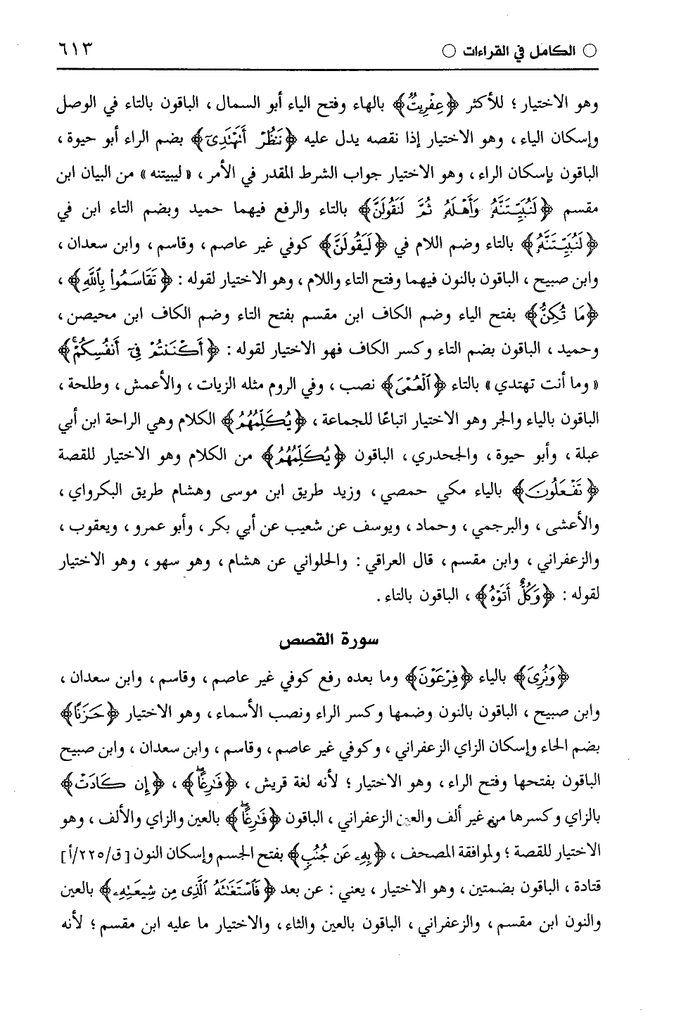 (وَنُرِىَ) بالياء (فِرْعَوْنَ) وما بعده رفع كوفي غير عَاصِم، وقاسم، وابْن سَعْدَانَ، وابن صبيح، الباقون بالنون وضمها وكسر الراء ونصب الأسماء، وهو الاختيار (وَحَزَنًا) بضم الحاء وإسكان الزاي الزَّعْفَرَانِيّ، وكوفي غير عَاصِم، وقاسم، وابْن سَعْدَانَ، وابن صبيح الباقون بفتحها وفتح الراء، وهو الاختيار، لأنه لغة قريش، (فَارِغًا)، (إِنْ كَادَتْ) بالزاي وكسرها من غير ألف والعين، الزَّعْفَرَانِيّ، الباقون (فَارِغًا) بالعين والزاي والألف، وهو الاختيار للقصة، ولموافقة المصحف، (بِهِ عَن جُنُبٍ) بفتح الجيم وإسكان النون قَتَادَة، الباقون بضمتين، وهو الاختيار، يعني: عن بعد (فَاسْتَغَاثَهُ الَّذِي مِنْ شِيعَتِهِ) بالعين والنون ابْن مِقْسَمٍ، والزَّعْفَرَانِيّ، الباقون بالعين والثاء، والاختيار ما عليه ابْن مِقْسَمٍ؛ لأنه