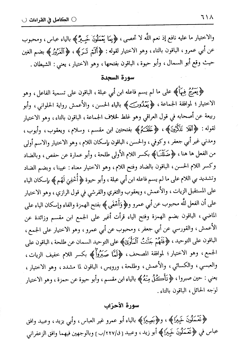 (يَعْرجٌ فِيهَا) على ما لم يسم فاعله ابن أبي عبلة، الباقون على تسمية الفاعل، وهو الاختيار؛ لموافقة الجماعة، (يَعُدُّونَ) بالياء الحسن، والْأَعْمَش رواية الحلواني، وأبو ربيعة عن أصحابه في قول العراقي وهو غلط لخلاف الجماعة، الباقون بالتاء، وهو الاختيار لقوله: (أَفَلَا تَتَذَكَّرُونَ)، (خَلَقَهُ) بفتحتين ابْن مِقْسَمٍ، وسلام، ويَعْقُوب، وأيوب، ومدني غير أبي جعفر، وكوفي، والحسن، الباقون بإسكان اللام، وهو الاختيار والاسم أولى من الفعل ها هنا، (ضَلَلْنَا) بكسر اللام الأولى طَلْحَة، وأبو عمارة عن حفص، وبالضاد وكسر اللام الحسن، الباقون بالضاد وفتح اللام، وهو الاختيار معناه: عيينا، وبضم الضاد وتشديد اللام على ما لم يسم فاعله ابن أبي عبلة، وأبو حيوة (أُخْفِيَ لَهُم) بإسكان الياء على المستقبل الزَّيَّات، والْأَعْمَش، ويَعْقُوب والثغري والقرشي في قول الرَّازِيّ، وهو الاختيار على أن الفعل للَّه محبوب عن أَبِي عَمْرٍو و (وَأَخْفَى) بفتح الهمزة والفاء وإسكان الياء على الماضي، الباقون بضم الهمزة وفتح الياء قرأت أغير على الجمع ابْن مِقْسَمٍ وزائدة عن الْأَعْمَش، والقورسي عن أبي جعفر، ومحبوب عن أَبِي عَمْرٍو، وهو الاختيار على الجمع، الباقون على التوحيد، (فَلَهُمْ جَنَّاتُ الْمَأْوَى) على التوحيد السمان عن طَلْحَة، الباقون على الجمع، وهو الاختيار، لموافقة المصحف، (لِمَا صَبَرُوا) بكسر اللام خفيف الزَّيَّات، والْعَبْسِيّ، والكسائي، والْأَعْمَش، وطَلْحَة، ورُوَيْس، الباقون (لَمَّا) مشدد، وهو الاختيار، يعني: حين صبروا، (تَأْكُلُ مِنْهُ) بالياء ابْن مِقْسَمٍ، وأبو حيوة عن حَمْزَة، وهو الاختيار لوجود الحائل، الباقون بالتاء.