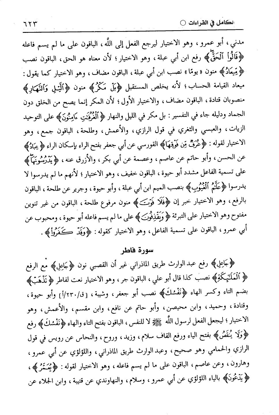 (جَاعِلِ) رفع عبد الوارث طريق الماذراني غير أن القصبي نون (جَاعِلٌ) مْع الرفع (الْمَلَائِكَةَ) كذا قال أبو علي، الباقون جر، وهو الاختيار نعت لفاطر (تُذْهِبْ) بضم التاء وكسر الهاء (نَفْسَكَ) نصب أبو جعفر، وشيبة، وأبو حيوة، وقَتَادَة، وَحُمَيْد، وابن مُحَيْصِن، وأَبُو حَاتِمٍ عن نافع، وابْن مِقْسَمٍ، والْأَعْمَش، وهو الاختيار، ليجعل الفعل لرسول اللَّه - صلى الله عليه وسلم - لا للنفس، الباقون بفتح التاء والهاء (نَفْسُكَ) رفع (وَلَا ينُْقَصُ) بفتح الياء ورفع القاف سلام، وزيد، وَرَوْحٌ، والنحاس عن رُوَيْس في قول الرَّازِيّ والْحَمَّامِيّ، وهو صحيح، وعبد الوارث طريق الماذراني، واللؤلؤي عن أَبِي عَمْرٍو، وهارون، وعن عَاصِم، الباقون على ما لم يسم فاعله، وهو الاختيار لقوله: (يُعَمَّرُ)، (يَدْعُونَ) بالياء اللؤلؤي عن أَبِي عَمْرٍو، وسلام، والنهاوندي عن قُتَيْبَة، وابن الجلاء عن