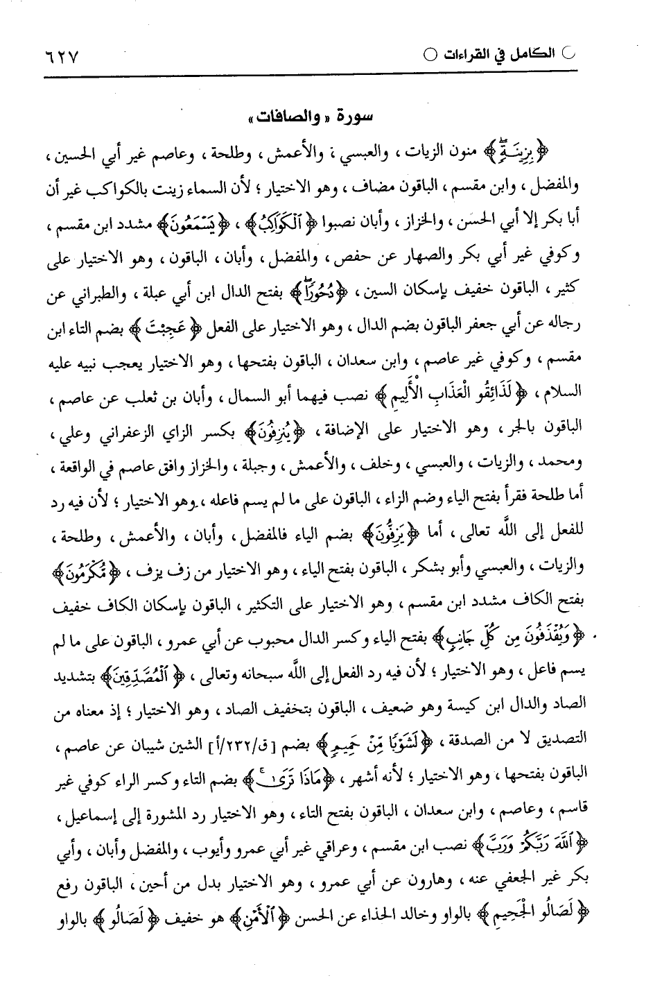 (بِزِينَةٍ) منون الزَّيَّات، والْعَبْسِيّ، والْأَعْمَش، وطَلْحَة، وعَاصِم غير أبي الحسين، والمفضل، وابْن مِقْسَمٍ، الباقون مضاف، وهو الاختيار، لأن السماء زينت بالكواكب غير أن أبا بكر إلا أبي الحسن، والخزاز، وأبان نصبوا (الْكَوَاكِبَ)، (يَسَّمَّعُونَ) مشدد ابْن مِقْسَمٍ، وكوفي غير أبي بكر والصهار عن حفص، والمفضل، وأبان، الباقون، وهو الاختيار على كثير، الباقون خفيف بإسكان السين، (دُحُورًا) بفتح الدال ابن أبي عبلة، والطبراني عن رجاله عن أبي جعفر الباقون بضم الدال، وهو الاختيار على الفعل (عَجِبْتَ) بضم التاء ابن مقسم، وكوفي غير عَاصِم، وابْن سَعْدَانَ، الباقون بفتحها، وهو الاختيار يعجب نبيه عليه السلام، (لَذَائِقُو الْعَذَابِ الْأَلِيمِ) نصب فيهما أبو السَّمَّال، وأبان بن ثعلب عن عَاصِم، الباقون بالجر، وهو الاختيار على الإضافة، (يُنْزَفُونَ) بكسر الزاي الزَّعْفَرَانِيّ وعلي، ومحمد، والزَّيَّات، والْعَبْسِيّ، وخلف، والْأَعْمَش، وجبلة، والخزاز وافق عَاصِم في الواقعة، أما طَلْحَة فقرأ بفتح الياء وضم الزاء، الباقون على ما لم يسم فاعله، وهو الاختيار، لأن فيه رد للفعل إلى اللَّه تعالى، أما (يَزِفُّونَ) بضم الياء فالمفضل، وأبان، والْأَعْمَش، وطَلْحَة، والزَّيَّات، والْعَبْسِيّ وأبو بشكر، الباقون بفتح الياء، وهو الاختيار من زف يزف، (مُكْرَمُونَ) بفتح الكاف مشدد ابْن مِقْسَمٍ، وهو الاختيار على التكثير، الباقون بإسكان الكاف خفيف (وَيُقْذَفُونَ مِنْ كُلِّ جَانِبٍ) بفتح الياء وكسر الذال محبوب عن أَبِي عَمْرٍو، الباقون على ما لم يسم فاعل، وهو الاختيار؛ لأن فيه رد الفعل إلى اللَّه سبحانه وتعالى، (الْمُصَّدِّقِينَ) بتشديد الصاد والدال ابن كيسة وهو ضعيف، الباقون بتخفيف الصاد، وهو الاختيار؛ إذ معناه من التصديق لا من الصدقة، (لَشَوْبًا مِنْ حَمِيمٍ) بضم الشين شيبان عن عَاصِم، الباقون بفتحها، وهو الاختيار؛ لأنه أشهر، (مَاذَا تَرَى) بضم التاء وكسر الراء كوفي غير قاسم، وعَاصِم، وابْن سَعْدَانَ، الباقون بفتح التاء، وهو الاختيار رد المشورة إلى إسماعيل، (اللَّهَ رَبَّكُمْ وَرَبَّ) نصب ابْن مِقْسَمٍ، وعراقي غير أَبِي عَمْرٍو وأيوب، والمفضل وأبان، وأبي بكر غير الجعفي عنه، وهارون عن أَبِي عَمْرٍو، وهو الاختيار بدل من أحسن، الباقون رفع (صَالُو الجحِيمِ) بالواو وخالد الحذاء عن الحسن (صَالُ) خفيف (صَالُو) بالواو
