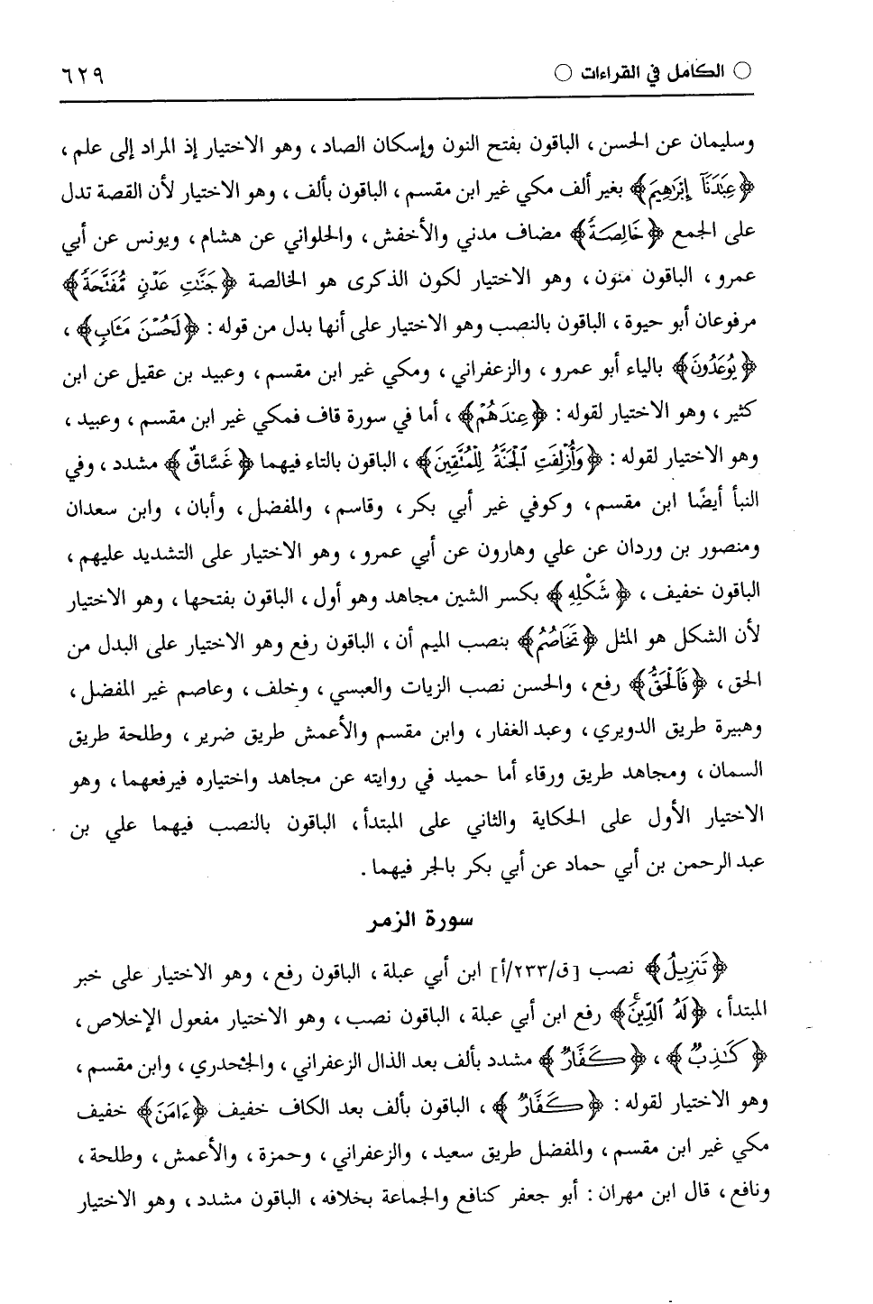 وسليمان عن الحسن، الباقون بفتح النون وإسكان الصاد، وهو الاختيار إذ المراد إلى علم، (عِبَادَنَا إِبْرَاهِيمَ) بغير ألف مكي غير ابْن مِقْسَمٍ، الباقون بألف، وهو الاختيار لأن القصة تدل على الجمع (بِخَالِصَةِ) مضاف مدني والْأَخْفَش، والحلواني عن هشام، ويونس عن أبي عمرو، الباقون منون، وهو الاختيار لكون الذكرى هو الخالصة (جَنَّاتُ عَدْنٍ مُفَتَّحَةٌ) مرفوعان أبو حيوة، الباقون بالنصب وهو الاختيار على أنها بدل من قوله: (لَحُسْنَ مَآبٍ)، (يُوعَدُونَ) بالياء أَبُو عَمْرٍو، والزَّعْفَرَانِيّ، ومكي غير ابْن مِقْسَمٍ، وعبيد بن عقيل عن ابن كثير، وهو الاختيار لقوله: (عِندهُم)، أما في سورة قاف فمكي غير ابْن مِقْسَمٍ، وعبيد، وهو الاختيار لقوله: (وَأُزْلِفَتِ الْجَنَّةُ لِلْمُتَّقِينَ)، الباقون بالتاء فيهما (غَسَّاقٌ) مشدد، وفي النبأ أيضا ابْن مِقْسَمٍ، وكوفي غير أبي بكر، وقاسم، والمفضل، وأبان، وابْن سَعْدَانَ ومنصور بن وردان عن علي وهارون عن أَبِي عَمْرٍو، وهو الاختيار على التشديد عليهم، الباقون خفيف، (شَكْلِهِ) بكسر الشين مجاهد وهو أول، الباقون بفتحها، وهو الاختيار لأن الشكل هو المثل (تَخَاصُمُ) بنصب الميم، الباقون رفع وهو الاختيار على البدل من الحق، (قَالَ فَالْحَقُّ) رفع، والحسن نصب الزَّيَّات والْعَبْسِيّ، وخلف، وعَاصِم غير المفضل، وهبيرة طريق الدويري، وعبد الغفار، وابْن مِقْسَمٍ والْأَعْمَش طريق ضرير، وطَلْحَة طريق السمان، ومجاهد طريق ورقاء أما حميد في روايته عن مجاهد واختياره فيرفعهما، وهو الاختيار الأول على الحكاية والثاني على المبتدأ، الباقون بالنصب فيهما علي بن عبد الرحمن بن أبي حماد عن أبي بكر بالجر فيهما.