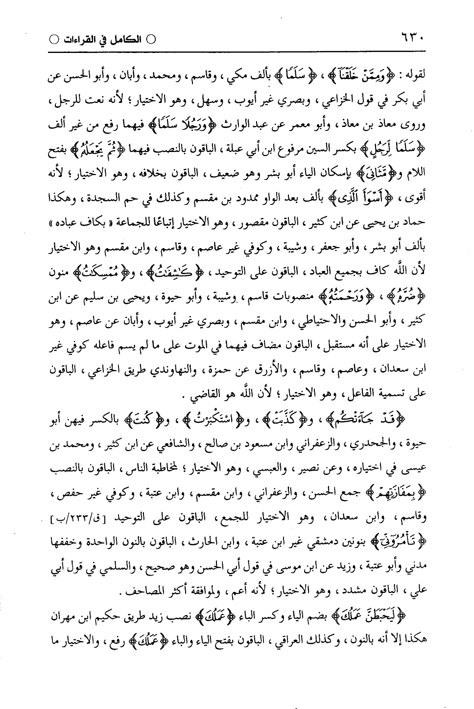 لقوله: (مِمَّنْ خَلَقْنَا)، (سَلَمًا) بألف مكي، وقاسم، ومحمد، وأبان، وأبو الحسن عن أبي بكر في قول الْخُزَاعِيّ، وبصري غير أيوب، وسهل، وهو الاختيار، لأنه نعت للرجل، وروى معاذ بن معاذ، وأبو معمر عن عبد الوارث (وَرَجُلًا سَلَمًا) فيهما رفع من غير ألف (سَلَمًا لِرَجُلٍ) بكسر السين مرفوع ابن أبي عبلة، الباقون بالنصب فيهما (ثُمَّ يَجْعَلُهُ) بفتح اللام و (مَثَانِيَ) بإسكان الياء أبو بشر وهو ضعيف، الباقون بخلافه، وهو الاختيار؛ لأنه أقوى، (أَسْوَأَ الَّذِي) بألف بعد الواو ممدود بْن مِقْسَمٍ وكذلك في حم السجدة، وهكذا حماد بن يحيى عن ابْن كَثِيرٍ، الباقون مقصور، وهو الاختيار اتباعًا للجماعة " بكاف عباده " بألف أبو بشر، وأبو جعفر، وشيبة، وكوفي غير عَاصِم، وقاسم، وابْن مِقْسَمٍ وهو الاختيار لأن اللَّه كاف بجميع العباد، الباقون على التوحيد، (كَاشِفَاتٌ)، و (مُمْسِكَاتٌ) منون (ضُرَّهُ)، (رَحْمَتَهُ) منصوبان قاسم، وشيبة، وأبو حيوة، ويحيى بن سليم عن ابن كثير، وأبو الحسن والاحتياطي، وابْن مِقْسَمٍ، وبصري غير أيوب، وأبان عن عَاصِم، وهو الاختيار على أنه مستقبل، الباقون مضاف فيهما في الموت على ما لم يسم فاعله كوفي غير ابْن سَعْدَانَ، وعَاصِم، وقاسم، والأزرق عن حَمْزَة، والنهاوندي طريق الْخُزَاعِيّ، الباقون على تسمية الفاعل، وهو الاختيار؛ لأن اللَّه هو القاضي.