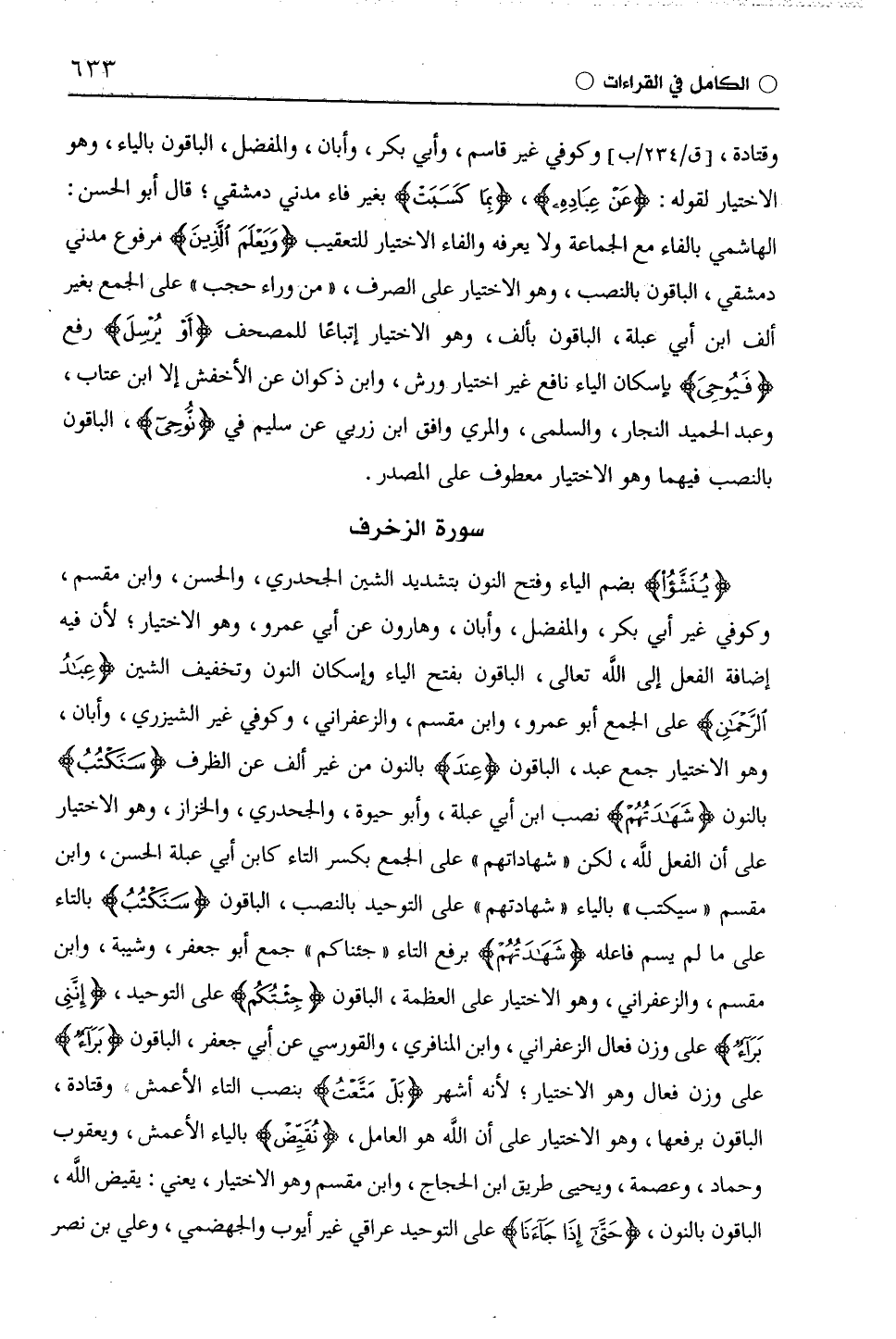 (يُنَشَّأُ) بضم الياء وفتح النون بتشديد الشين الْجَحْدَرَيّ، والحسن، وابْن مِقْسَمٍ، وكوفي غير أبي بكر، والمفضل، وأبان، وهارون عن أَبِي عَمْرٍو، وهو الاختيار، لأن فيه إضافة الفعل إلى اللَّه تعالى، الباقون بفتح الياء وإسكان النون وتخفيف الشين (عِبَادُ الرَّحْمَنِ) على الجمع أَبُو عَمْرٍو، وابْن مِقْسَمٍ، والزَّعْفَرَانِيّ، وكوفي غير الشيزري، وأبان، وهو الاختيار جمع عبد، الباقون (عِندَ) بالنون من غير ألف عن الظرف (سَنَكتُبُ) بالنون (شَهَادَتَهُمْ) نصب ابن أبي عبلة، وأبو حيوة، والْجَحْدَرَيّ، والخزاز، وهو الاختيار على أن الفعل للَّه، لكن " شهاداتهم " على الجمع بكسر التاء كابن أبي عبلة الحسن، وابن مقسم " سيكتب " بالياء " شَهَادَتَهُمْ " على التوحيد بالنصب، الباقون (سَنَكتُبُ) بالتاء على ما لم يسم فاعله (شَهَادَتُهُمْ) برفع التاء " جئناكم " جمع أبو جعفر، وشيبة، وابن مقسم، والزَّعْفَرَانِيّ، وهو الاختيار على العظمة، الباقون (جِئْتُكُمْ) على التوحيد، (إِنَّنِي بُرَاءٌ) على وزن فُعَال الزَّعْفَرَانِيّ، وابن المناقري، والقورسي عن أبي جعفر، الباقون (بَرَاءٌ) على وزن فعال وهو الاختيار، لأنه أشهر (بَلْ مَتَّعْتُ) بنصب التاء الْأَعْمَش وقَتَادَة، الباقون برفعها، وهو الاختيار على أن اللَّه هو العامل، (نُقَيِّضْ) بالياء الْأَعْمَش، ويعقوب وحماد، وعصمة، ويحيى طريق ابن الْحَجَّاج، وابْن مِقْسَمٍ وهو الاختيار، يعني: يقيض اللَّه، الباقون بالنون، (حَتَّى إِذَا جَاءَنَا) على التوحيد عراقي غير أيوب والجهضمي، وعلي بن نصر