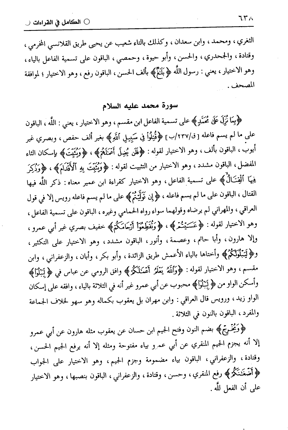 (بِمَا نُزِّلَ عَلَى مُحَمَّدٍ) على تسمية الفاعل ابْن مِقْسَمٍ، وهو الاختيار، يعني: اللَّه، الباقون على ما لم يسم فاعله، (قَاتَلُوا فِي سَبِيلِ اللَّهِ) بغير ألف حفص، وبصري غير أيوب، الباقون بألف، وهو الاختيار لقوله: (فَلَنْ يُضِلَّ أَعْمَالَهُمْ)، (وَيُثَبِّتْ) بإسكان الثاء المفضل، الباقون مشدد، وهو الاختيار من التثبيت لقوله: (وَيُثَبِّتَ بِهِ الْأَقْدَامَ)، (وَذُكِرَ فِيهَا الْقِتَالُ) على تسمية الفاعل، وهو الاختيار كقراءة ابن عمير معناه: ذكر اللَّه فيها القتال، الباقون على ما لم يسم فاعله، (إِنْ تَوَلَّيْتُمْ) على ما لم يسم فاعله رُوَيْس إلا في قول العراقي، والمهراني لم يرضاه وقولهما سواء رواه الْحَمَّامِيّ وغيره، الباقون على تسمية الفاعل، وهو الاختيار لقوله: (عَسَيْتُمْ)، (وَتُقَطِّعُوا أَرْحَامَكُمْ) خفيف بصري غير أَبِي عَمْرٍو، وإلا هارون، وأبا حاتم، وعصمة، وأنور، الباقون مشدد، وهو الاختيار على التكثير، و (وَلَنَبْلُوَنَّكُمْ) وأختاها بالياء الْأَعْمَش طريق الزائدة، وأبو بكر، وأبان، والزَّعْفَرَانِيّ، وابن مقسم، وهو الاختيار لقوله: (وَاللَّهُ يَعْلَمُ أَعْمَالَكُمْ) وافق الرومي عن عباس في (وَنَبْلُوَ) وأسكن الواو من (وَنَبْلُوَ) محبوب عن أَبِي عَمْرٍو غير أنه في الثلاثة بالياء، وافقه على إسكان الواو زيد، ورُوَيْس قال العراقي: وابن مهران بل يَعْقُوب بكماله وهو سهو لخلاف الجماعة والمفرد، الباقون بالنون في الثلاثة.