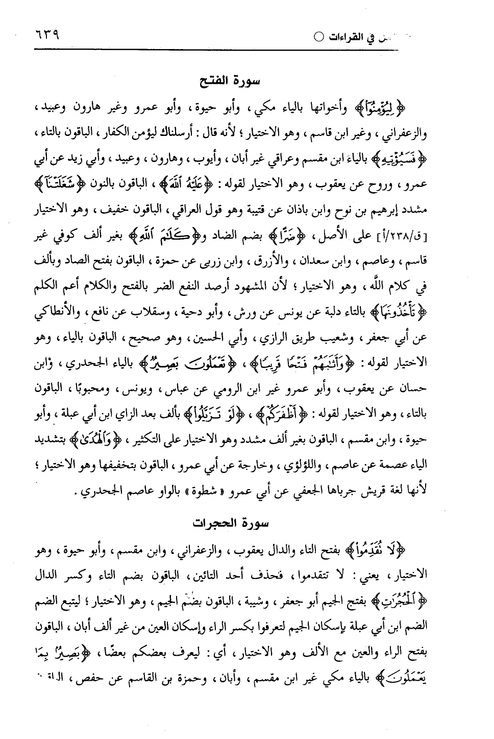 (لِيؤمِنُوا) وأخواتها بالياء مكي، وأبو حيوة، وأَبُو عَمْرٍو وغير هارون وعبيد، والزَّعْفَرَانِيّ، وغير ابن قاسم، وهو الاختيار؛ لأنه قال: أرسلناك ليؤمن الكفار، الباقون بالتاء، (فَسَيُؤتِيهِ) بالياء ابْن مِقْسَمٍ وعراقي غير أبان، وأيوب، وهارون، وعبيد، وأبي زيد عن أبي عمرو، وَرَوْحٌ عن يعقوب، وهو الاختيار لقوله: (عَلَيْهُ اللَّهَ)، الباقون بالنون (شَغَلتَنَاَ) مشدد إبرهيم بن نوح وابن باذان عن قُتَيْبَة وهو قول العراقي، الباقون خفيف، وهو الاختيار على الأصل، (ضَرًّا) بضم الضاد و (كَلَامَ اللَّهِ) بغير ألف كوفي غير قاسم، وعَاصِم، وابْن سَعْدَانَ، والأزرق، وابن زربي عن حَمْزَة، الباقون بفتح الصاد وبألف في كلام اللَّه، وهو الاختيار؛ لأن المشهود أرصد النفع الضر بالفتح والكلام أعم الكلم (تَأضذُونَهَا) بالتاء دلبة عن يونس عن ورش، وأبو دحية، وسقلاب عن نافع، والإنطاكي عن أبي جعفر، وشعيب طريق الرَّازِيّ، وأبي الحسين، وهو صحيح، الباقون بالياء، وهو الاختيار لقوله: (وَأَثَابَهُمْ فَتْحًا قَرِيبًا)، (بِمَا تَعْمَلُونَ بَصِيرًا) بالياء الْجَحْدَرَيّ، وابن حسان عن يعقوب، وأَبُو عَمْرٍو غير ابن الرومي عن عباس، ويونس، ومحبوبًا، الباقون بالتاء، وهو الاختيار لقوله: (أَظْفَرَكُمْ)، (لَوْ تَزَيَّلُوا) بألف بعد الزاي ابن أبي عبلة، وأبو حيوة، وابْن مِقْسَمٍ، الباقون بغير ألف مشدد وهو الاختيار على التكثير، (وَالْهَدْيَ) بتشديد الياء عصمة عن عَاصِم، واللؤلؤي، وخارجة عن أَبِي عَمْرٍو، الباقون بتخفيفها وهو الاختيار؛ لأنها لغة قريش جرباها الجعفي عن أَبِي عَمْرٍو (شَطْوَه) بالواو عَاصِم الْجَحْدَرَيّ.