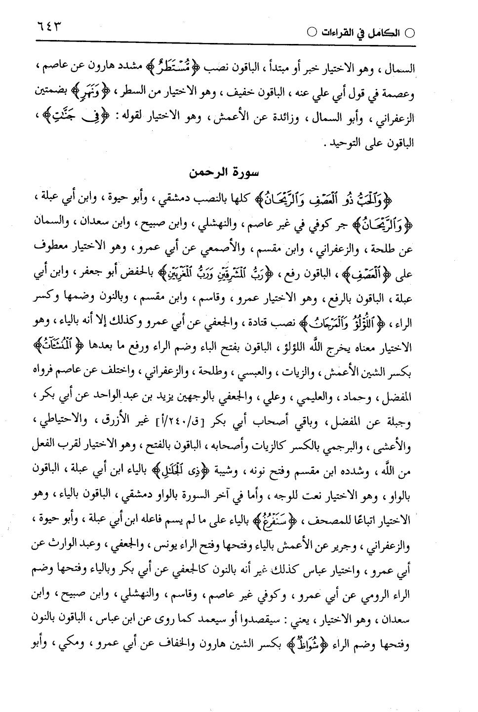 (وَالْحَبُّ ذُو الْعَصْفِ وَالرَّيْحَانُ) كلها بالنصب دمشقي، وأبو حيوة، وابن أبي عبلة، (وَالرَّيْحَانِ) جر كوفي في غير عَاصِم، والنهشلي، وابن صبيح، وابْن سَعْدَانَ، والسمان عن طَلْحَة، والزَّعْفَرَانِيّ، وابْن مِقْسَمٍ، والأصمعي عن أَبِي عَمْرٍو، وهو الاختيار معطوف على (الْعَصْفِ)، الباقون رفع، (رَبُّ الْمَشْرِقَيْنِ وَرَبُّ الْمَغْرِبَيْنِ) بالحفض أبو جعفر، وابن أبي عبلة، الباقون بالرفع، وهو الاختيار عمرو، وقاسم، وابْن مِقْسَمٍ، وبالنون وضمها وكسر الراء، (اللُّؤْلُؤُ وَالْمَرْجَانُ) نصب قَتَادَة، والجعفي عن أَبِي عَمْرٍو وكذلك إلا أنه بالياء، وهو الاختيار معناه يخرج اللَّه اللؤلؤ، الباقون بفتح الباء وضم الراء ورفع ما بعدها (الْمُنْشَئَاتُ) بكسر الشين الْأَعْمَش، والزَّيَّات، والْعَبْسِيّ، وطَلْحَة، والزَّعْفَرَانِيّ، واختلف عن عَاصِم فرواه المفضل، وحماد، والعليمي، وعلي، والجعفي بالوجهين يزيد بن عبد الواحد عن أبي بكر، وجبلة عن المفضل، وباقي أصحاب أبي بكر غير الأزرق، والاحتياطي، والأعشى، والبرجمي بالكسر كالزَّيَّات وأصحابه، الباقون بالفتح، وهو الاختيار لقرب الفعل من اللَّه، وشدده ابْن مِقْسَمٍ وفتح نونه، وشيبة (ذِي الْجَلَالِ) بالياء ابن أبي عبلة، الباقون بالواو، وهو الاختيار نعت للوجه، وأما في آخر السورة بالواو دمشقي، الباقون بالياء، وهو الاختيار اتباعًا للمصحف، (سَيُفْرَغُ) بالياء على ما لم يسم فاعله ابن أبي عبلة، وأبو حيوة، والزَّعْفَرَانِيّ، وجرير عن الْأَعْمَش بالياء وفتحها وفتح الراء يونس، والجعفي، وعبد الوارث عن أَبِي عَمْرٍو، واختيار عباس كذلك غير أنه بالنون كالجعفي عن أبي بكر وبالياء وفتحها وضم الراء الرومي عن أَبِي عَمْرٍو، وكوفي غير عَاصِم، وقاسم، والنهشلي، وابن صبيح، وابن سعدان، وهو الاختيار، يعني: سيقصدوا أو سيعمد كما روى عن ابن عباس، الباقون بالنون وفتحها وضم الراء (شُوَاظٌ) بكسر الشين هارون والخفاف عن أَبِي عَمْرٍو، ومكي، وأبو