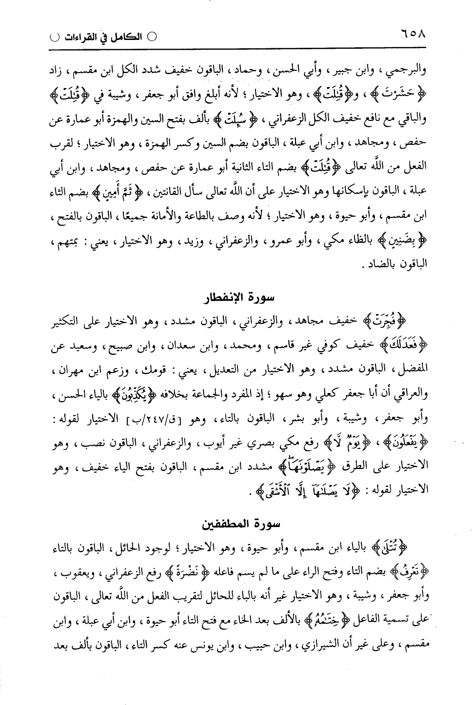 (فُجِّرَتْ) خفيف مجاهد، والزَّعْفَرَانِيّ، الباقون مشدد، وهو الاختيار على التكثير (فَعَدَلَكَ) خفيف كوفي غير قاسم، ومحمد، وابْن سَعْدَانَ، وابن صبيح، وسعيد عن المفضل، الباقون مشدد، وهو الاختيار من التعديل، يعني: قومك، وزعم ابن مهران، والعراقي أن أبا جعفر كعلي وهو سهو؛ إذ المفرد والجماعة بخلاف (يُكَذِّبوُنَ) بالياء الحسن، وأبو جعفر، وشيبة، وأبو بشر، الباقون بالتاء، وهو الاختيار لقوله: (يَفعَلُونَ)، (يَوْمَ لَا) رفع مكي بصري غير أيوب، والزَّعْفَرَانِيّ، الباقون نصب، وهو الاختيار على الطرق (يَصْلَوْنَهَا) مشدد ابْن مِقْسَمٍ، الباقون بفتح الياء خفيف، وهو الاختيار لقوله: (لَا يَصْلَاهَا إِلَّا الْأَشْقَى).