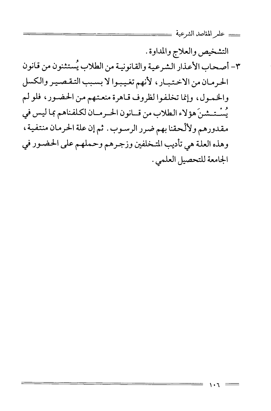 3- أصحاب الأعذار الشرعية والقانونية من الطلاب يُستثنون من قانون الحرمان من الاختبار؛ لأنهم تغيبوا بسبب التقصير والكسل والخمول؛ وإنما تخلفوا لظروف قاهرة منعتهم من الحضور؛ فلو لم يُسْتسنَ هؤلاء الطلاب من قانون الحرمان لكلفانهم بما ليس في مقدورهم ولألْحقنا بهم ضرر الرسوب، ثم إن علة الحرمان منتفية، وهذه العلة هي تأديب المتخلفين وزجرهم وحملهم على الحضور في الجامعة للتحصيل العلمي.