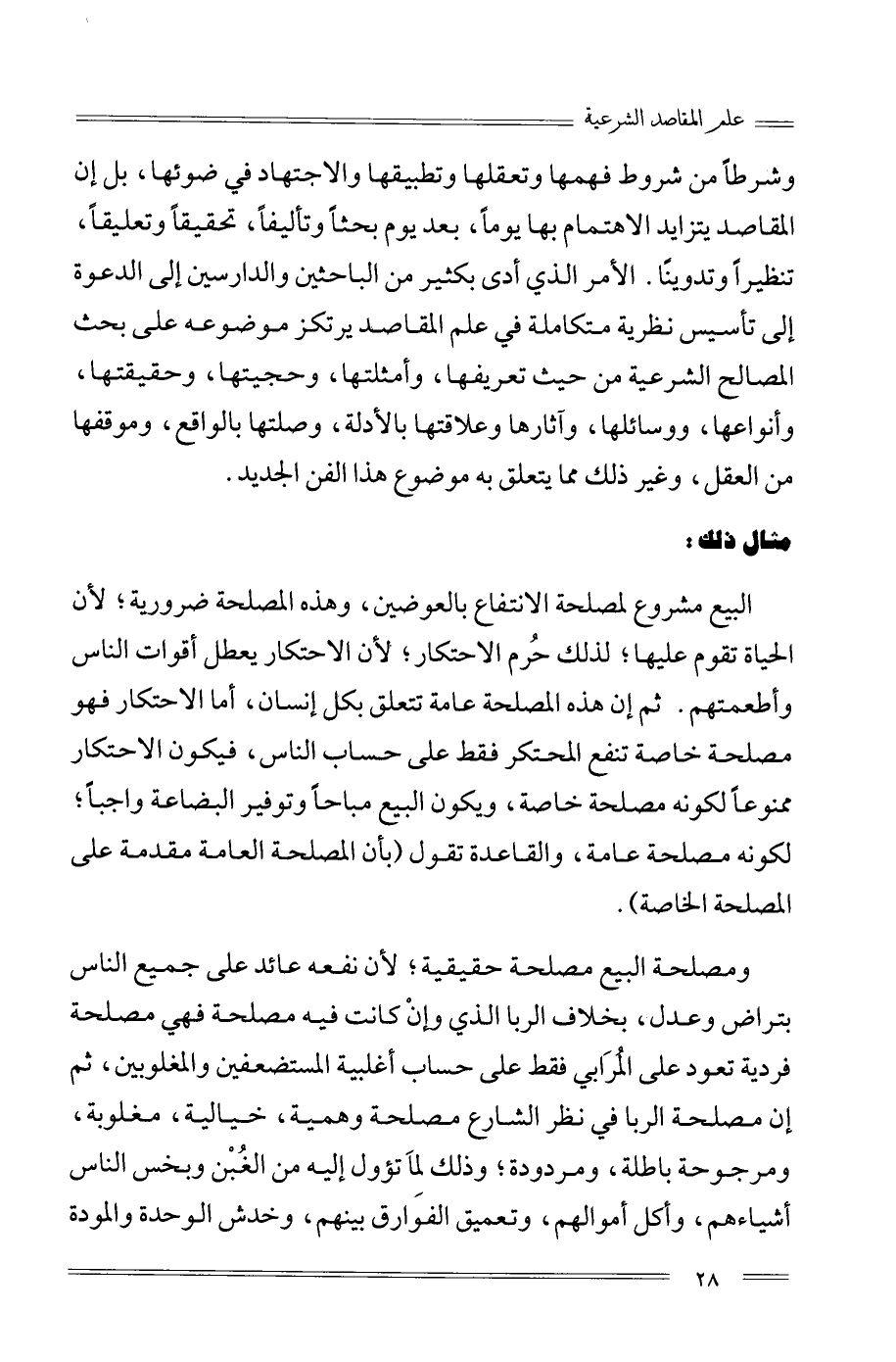 وشرطًا من شروط فهمها وتعقلها وتطبيقها والاجتهاد في ضوئها؛ بل إن المقاصد يتزايد الاهتمام بها يوميًا، بعد يوم بحثًا وتأليفًا؛ تحقيقًا وتعليقًا، تنظيرًا وتدوينًا؛ الأمر الذي أدى بكثير من الباحثين والدراسين إلى الدعوة إلى تأسيس نظرية متكامة في علم المقاصد يرتكز موضوعه على بحث المصالح الشرعية من حيث تعريفها وأمثلتها وحجيتها وحقيقتها، ومن العقل، وغير ذلك مما يتعلق به موضوع هذا الفن الجديد.