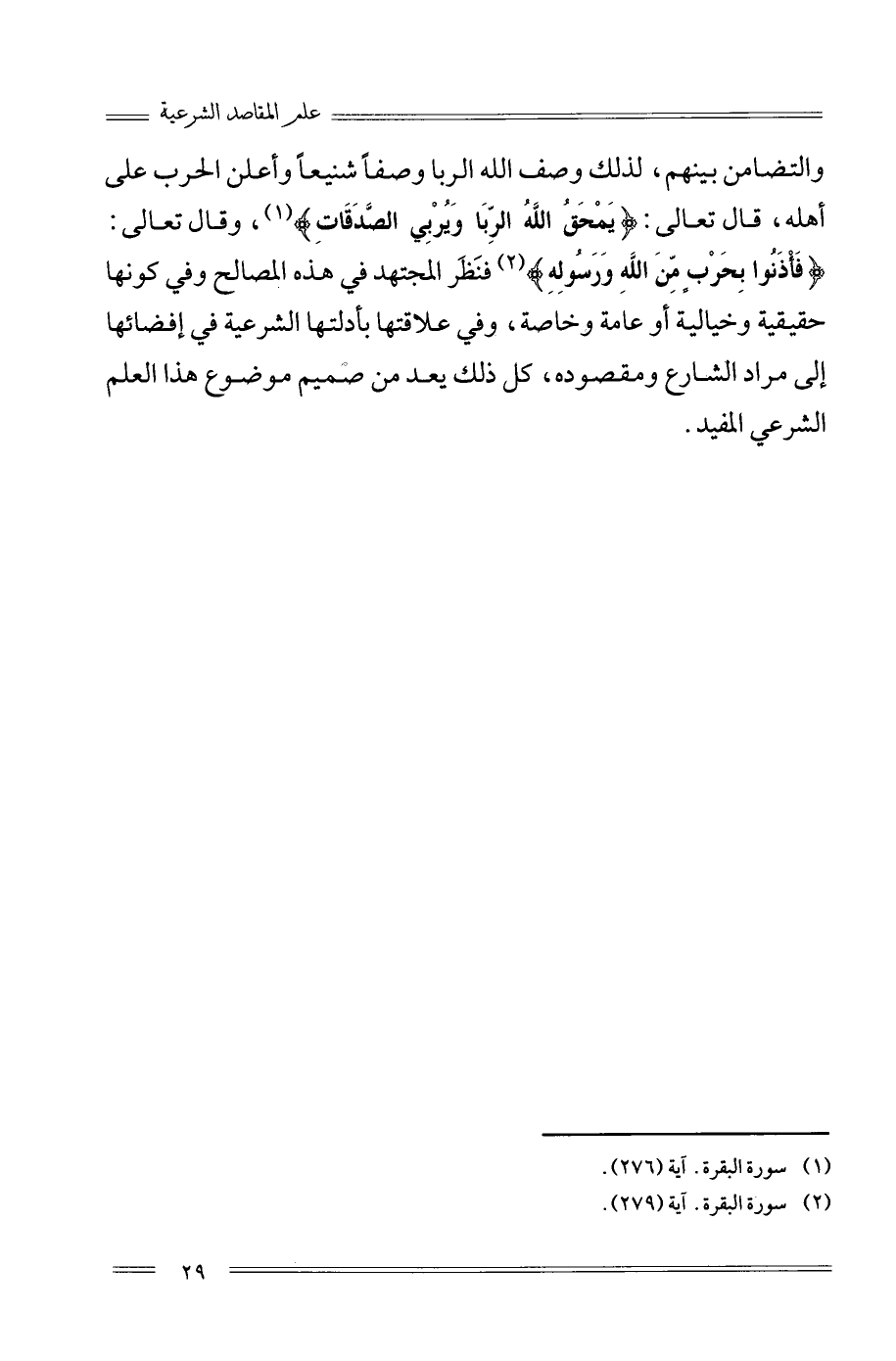 والتضامن بينهم؛ لذلك وصف الله الربا وصفًا شنيعًا، وأعلن الحرب على أهله، قال تعالى: {يَمْحَقُ اللَّهُ الرِّبَا وَيُرْبِي الصَّدَقَاتِ} 1، وقال تعالى: {فَأْذَنُوا بِحَرْبٍ مِنَ اللَّهِ وَرَسُولِه} 2 فنَظَر المجتهد في هذه المصالح وفي كونها حقيقية وخيالية أو عامة وخاصة، وفي علاقتها بأدتها الشرعية في إفضائها إلى مراد الشارع ومقصوده، كل ذلك يعد من صميم موضوع هذا العلم الشرعي المفيد.