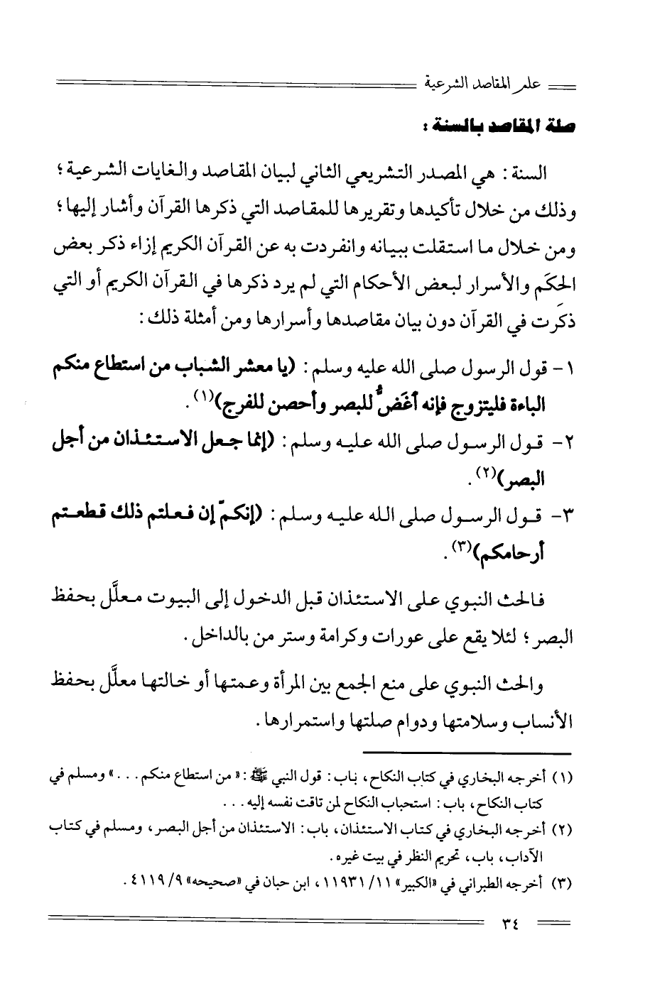 كما أن السنة نصت تنصيصًا مصرحًا به على تقرير بعض المقاصد الشرعية المعتبرة الأصلية والقطية، من ذلك قول الرسول صلى الله عليه وسلم: "لا ضرر وضرار" 4. وقول الرسول صلى الله عليه وسلم: "إن هذا الدين يُسر" 5.