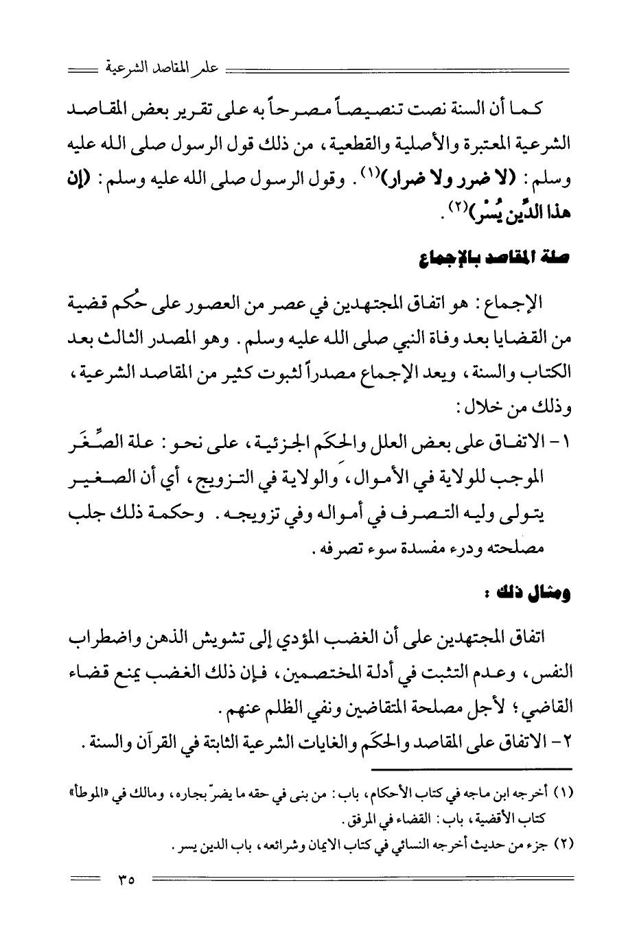 الإجماع: هو اتفاق المجتهدين في عصر من العصور على حُكم قضية من القضايا بعد وفاة النبي صلى الله عليه وسلم. وهو المصدر الثالث بعد الكتاب والسنة، ويعد الإجماع مصدرًا لثبوت كثير من المقاصد الشرعية؛ وذلك من خلال:
