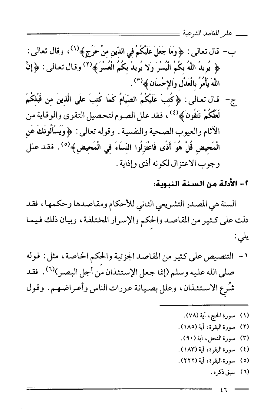 1- التنصيص على كثير من المقاصد الجزئية والحكم الخاصة، ومثل: قوله صلى الله عليه وسلم: "إنما جعل الاستئذان من أجل البصر" 6. قد شُرِع الاستئذان، وعلل بصيانة عورات الناس وأعراضهم، وقول