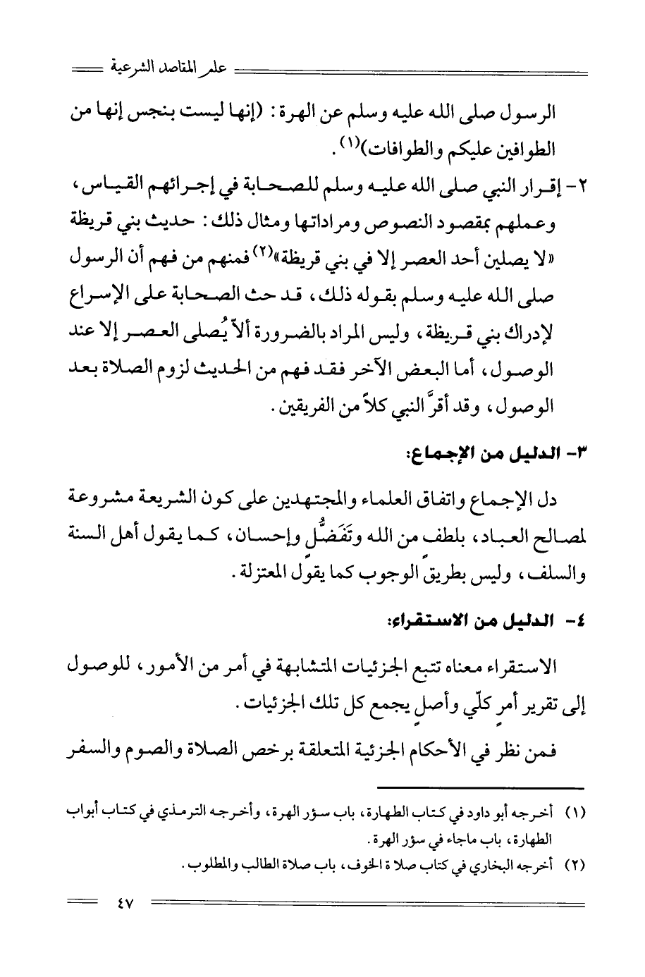 2- إقرار النبي صلى الله عليه وسلم للصحابة في إجرائهم القياس، وعملهم بمقصود النصوص ومراداتها، ومثال ذلك: حديث بني قريظة "لا يصلين أحد العصر إلا في بني قريظة" 2؛ فمنهم من فهم أن الرسول صلى الله عليه وسلم بقوله ذلك، قد حث الصحابة على الإسراع لإدراك بني قريظة، وليس المراد بالضرورة ألا يُصلي العصر إلى عند الوصول، أما البعض الآخر فقد فهم من الحديث لزوم الصلاة بعد الوصول، وقد أقرَّ النبي كلًا من الفريقين.