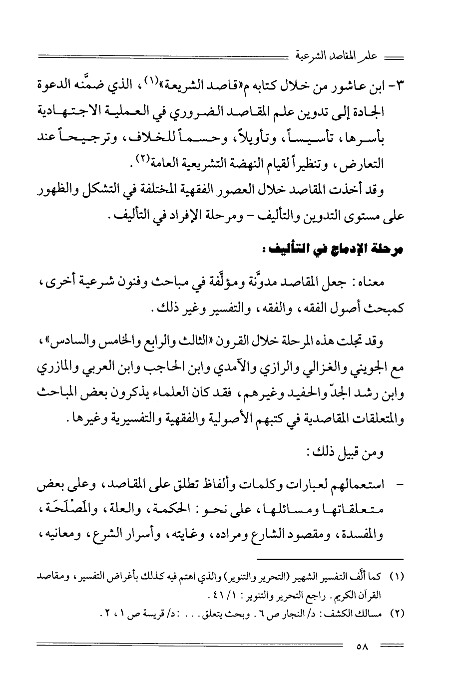 ابن عاشور من خلال كتابه "مقاصد الشريعة"1، الذي ضمنَّه الدعوة الجادة إلى تدوين علم المقاصد الضروري في العملية الاجتهادية بأسرها، تأسيسًا وتأويلًا، وحسمًا للخلاف، وترجيحًا عند التعارض، وتنظيرًا لقيام النهضة التشريعية العامة2.