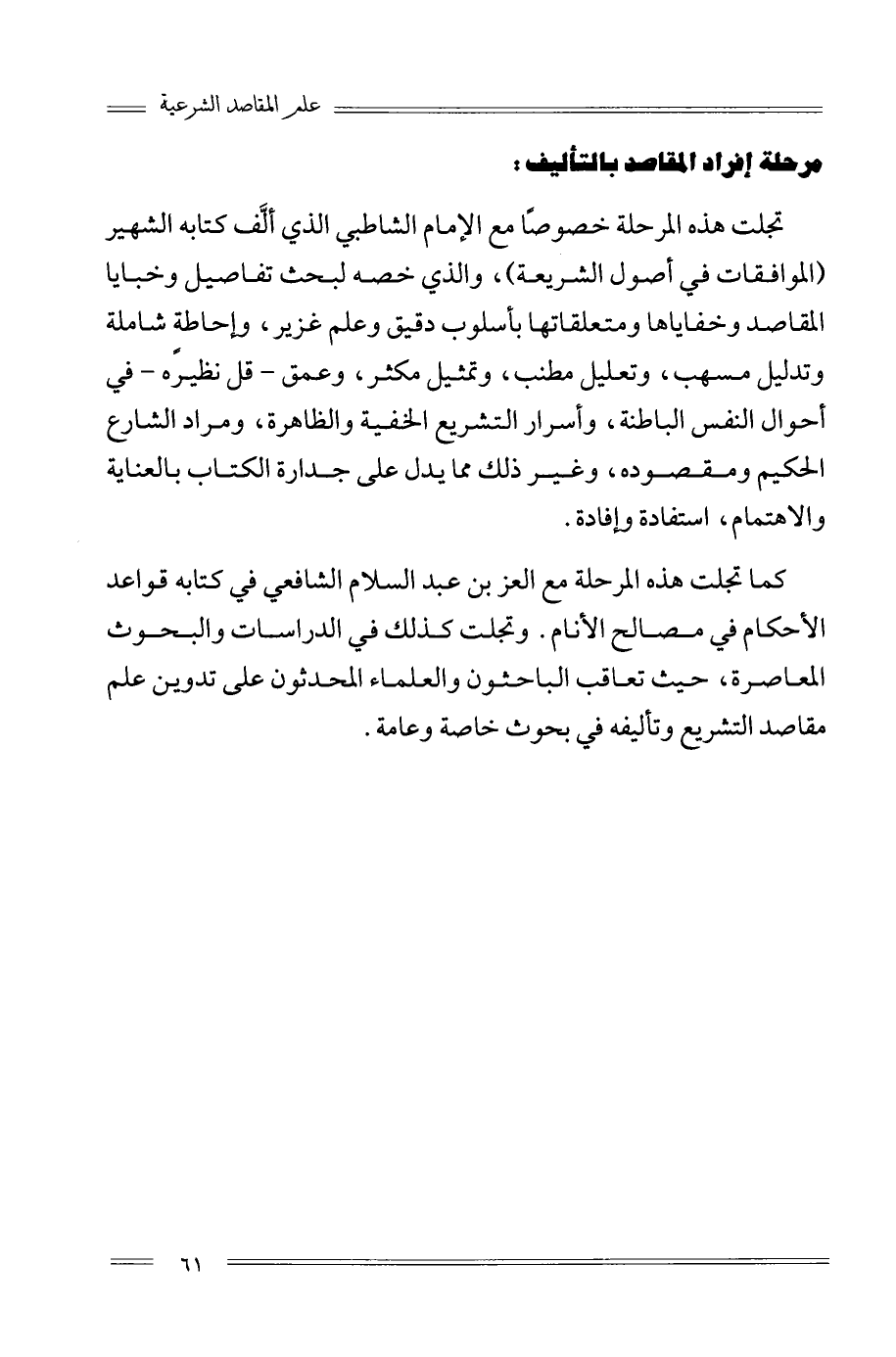 كما تجلت هذه المرحلة مع العز بن عبد السلام الشافعي في كتابه قواعد الأحكام في مصالح الأنام. وتجلت كذلك في الدراسات والبحوث المعاصرة؛ حيث تعاقب الباحثون والعلماء المحدثون على تدوين علم مقاصد التشريع وتأليفه في بحوث خاصة وعامة.