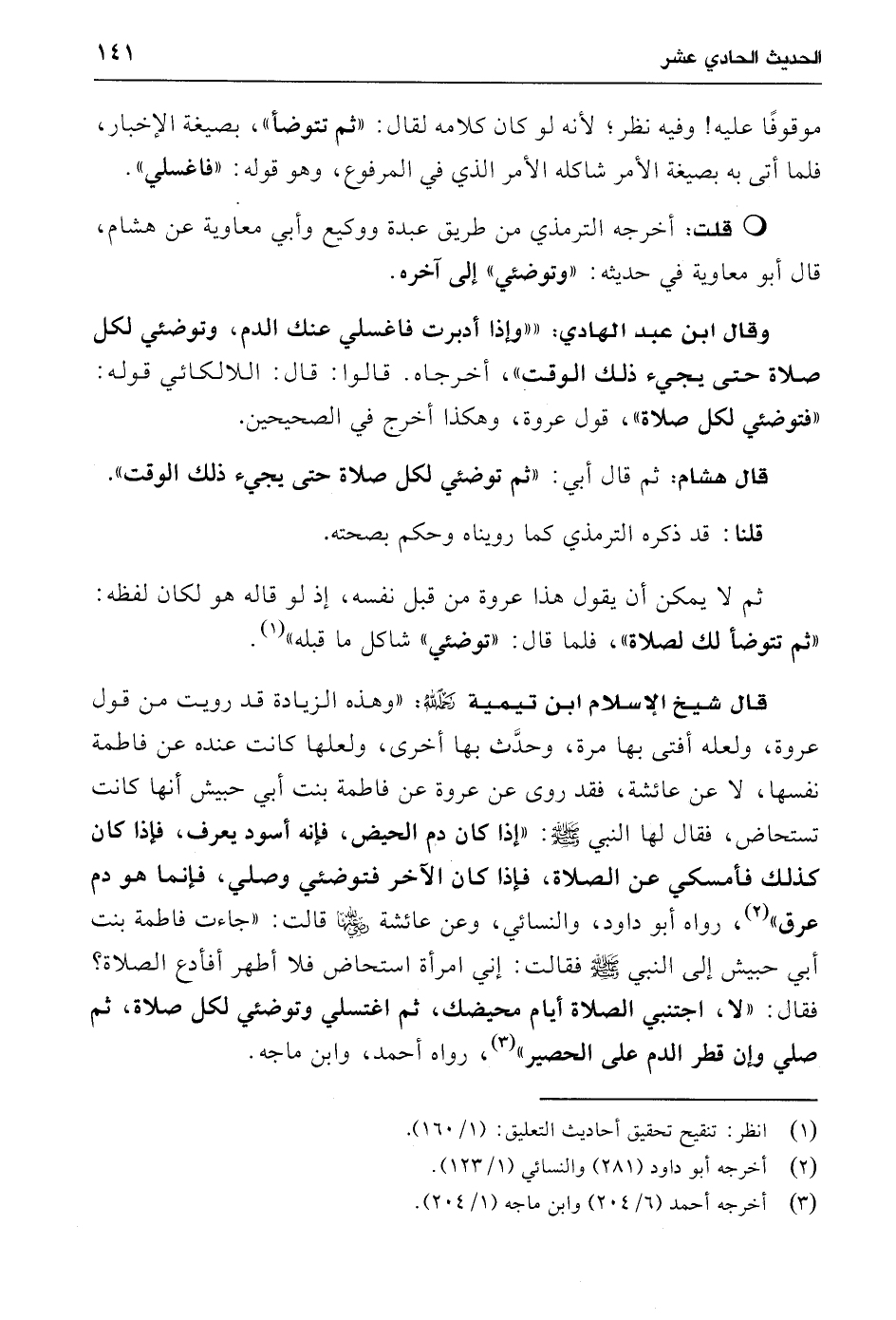 وقال ابن عبد الهادي: ""وإذا أدبرت فاغسلي عنك الدم، وتوضئي لكل صلاة حتى يجيء ذلك الوقت"، أخرجاه. قالوا: قال: اللالكائي قوله: "فتوضئي لكل صلاة"، قول عروة، وهكذا أخرج في الصحيحين.