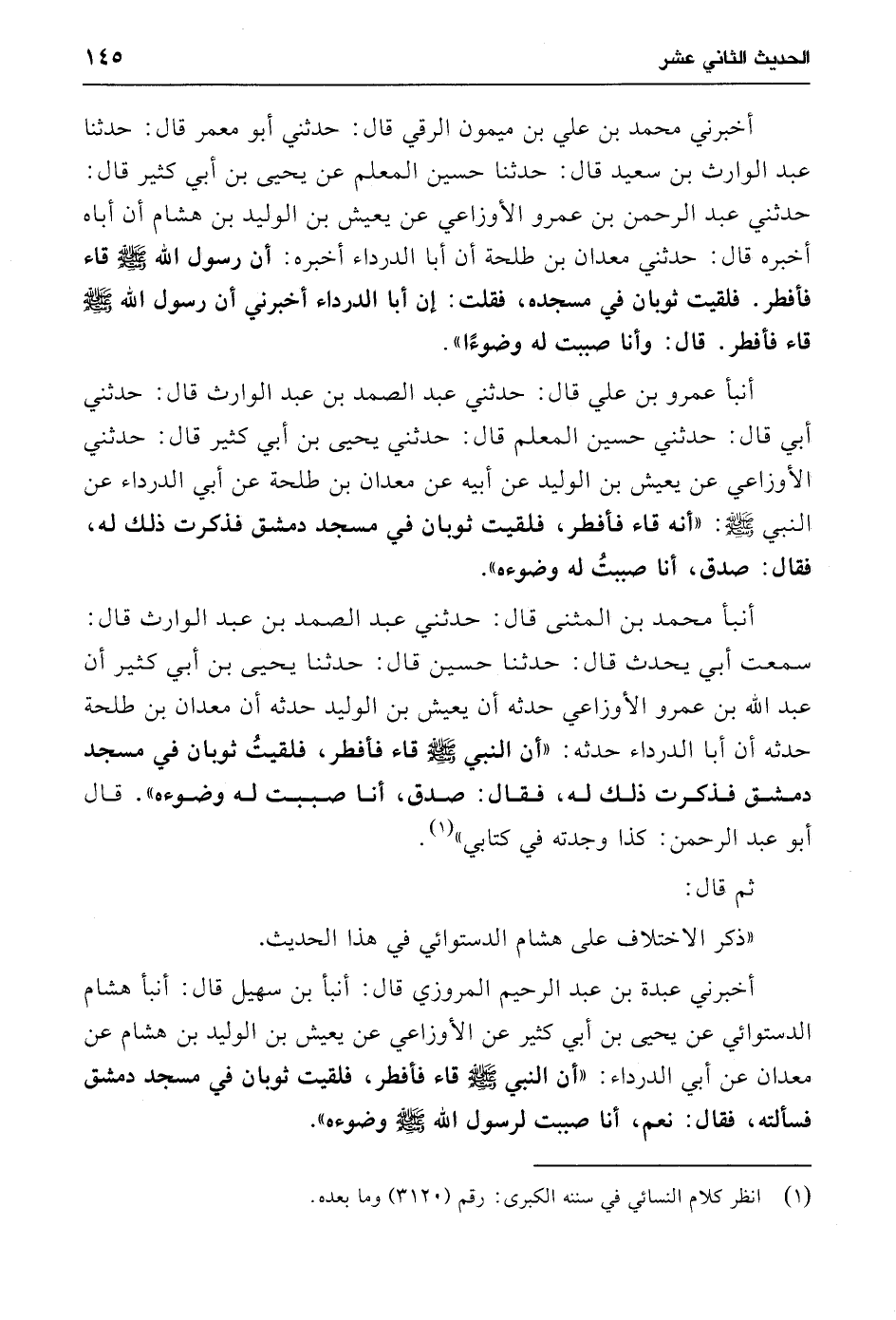 أنبأ محمد بن المثنى قال: حدثني عبد الصمد بن عبد الوارث قال: سمعت أبي يحدث قال: حدثنا حسين قال: حدثنا يحيى بن أبي كثير أن عبد الله بن عمرو الأوزاعي حدثه أن يعيش بن الوليد حدته أن معدان بن طلحة حدثه أن أبا الدرداء حدثه: "أن النبي - صلى الله عليه وسلم - قاء فأفطر، فلقيتُ ثوبان في مسجد دمشق فذكرت ذلك له، فقال: صدق، أنا صببت له وضوءه". قال أبو عبد الرحمن: كذا وجدته في كتابي" (¬1).