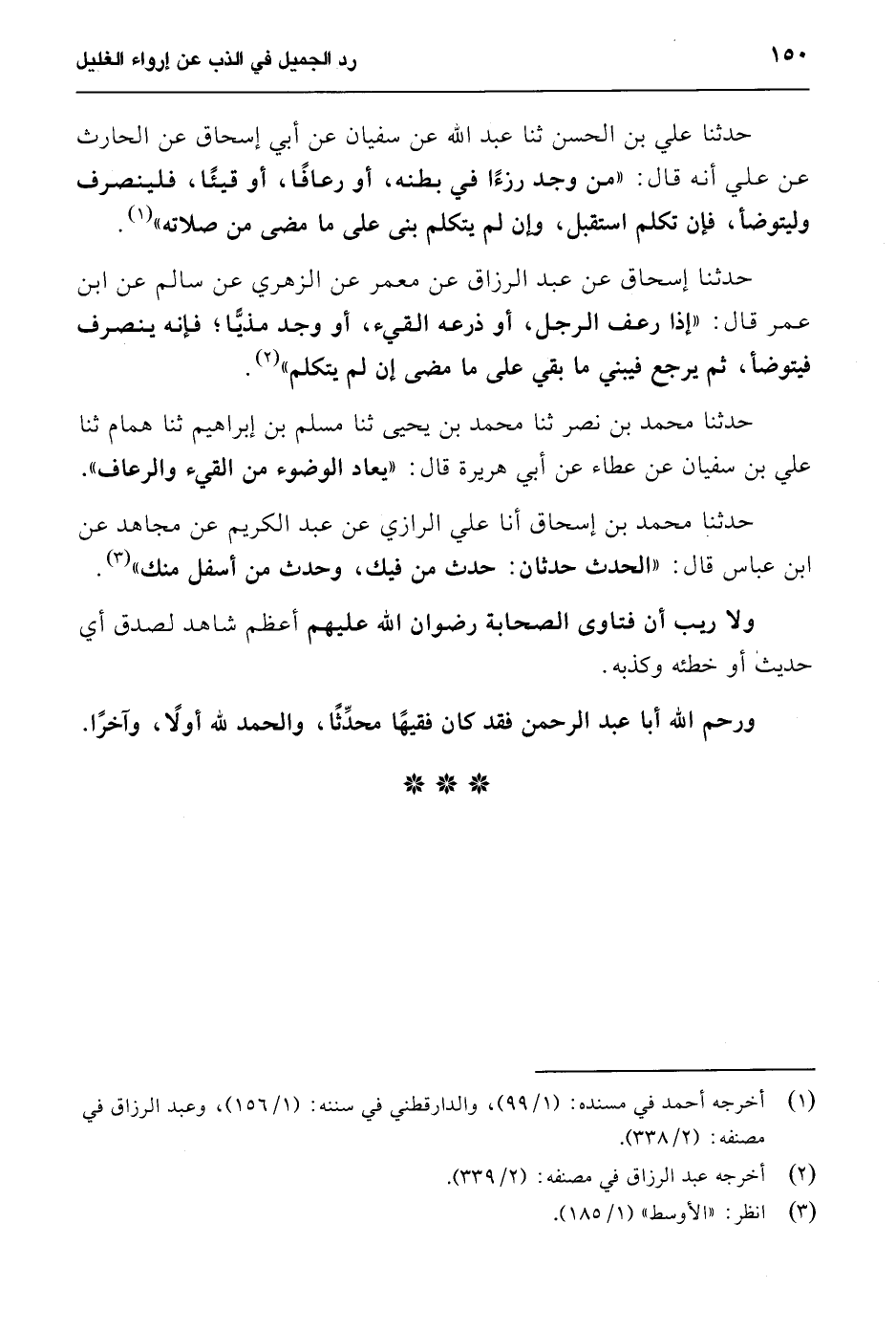 (¬1) أخرجه أحمد في مسنده: (1/ 99)، والدارقطني في سننه: (1/ 156)، وعبد الرزاق في مصنفه: (2/ 338).