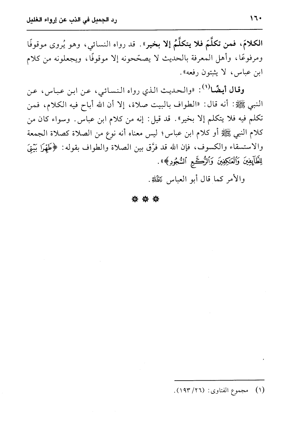 وقال أيضًا (¬1): "والحديث الذي رواه النسائي، عن ابن عباس، عن النبي - صلى الله عليه وسلم -: أنه قال: "الطواف بالبيت صلاة، إلا أن الله أباح فيه الكلام، فمن تكلم فيه فلا يتكلم إلا بخير". قد قيل: إنه من كلام ابن عباس. وسواء كان من كلام النبي - صلى الله عليه وسلم - أو كلام ابن عباس؛ ليس معناه أنه نوع من الصلاة كصلاة الجمعة والاستسقاء والكسوف، فإن الله قد فرَّق بين الصلاة والطواف بقوله: {طَهِّرَا بَيْتِيَ لِلطَّائِفِينَ وَالْعَاكِفِينَ وَالرُّكَّعِ السُّجُودِ (125)} [البقرة: 125].