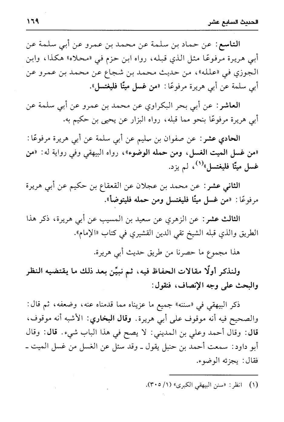 التاسع: عن حماد بن سلمة عن محمد بن عمرو عن أبي سلمة عن أبي هريرة مرفوعًا مثل الذي قبله، رواه ابن حزم في "محلاه" هكذا، وابن الجوزي في "علله"، من حديث محمد بن شجاع عن محمد بن عمرو عن أبي سلمة عن أبي هريرة مرفوعًا: "من غسل ميتًا فليغتسل".