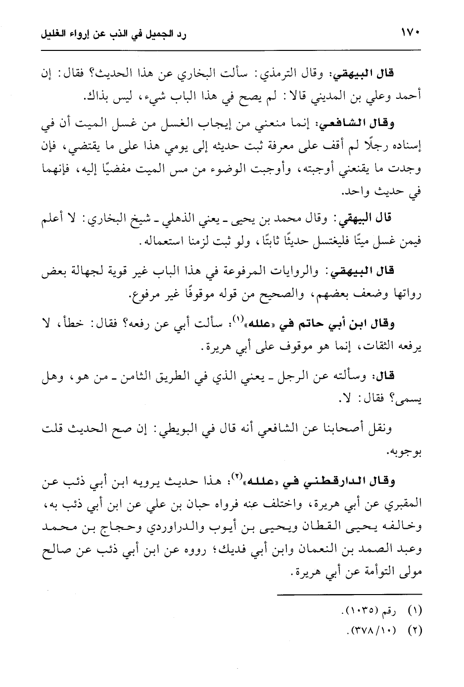قال البيهقي: وقال محمد بن يحيى -يعني الذهلي- شيخ البخاري: لا أعلم فيمن غسل ميتًا فليغتسل حديثًا ثابتًا، ولو ثبت لزمنا استعماله.