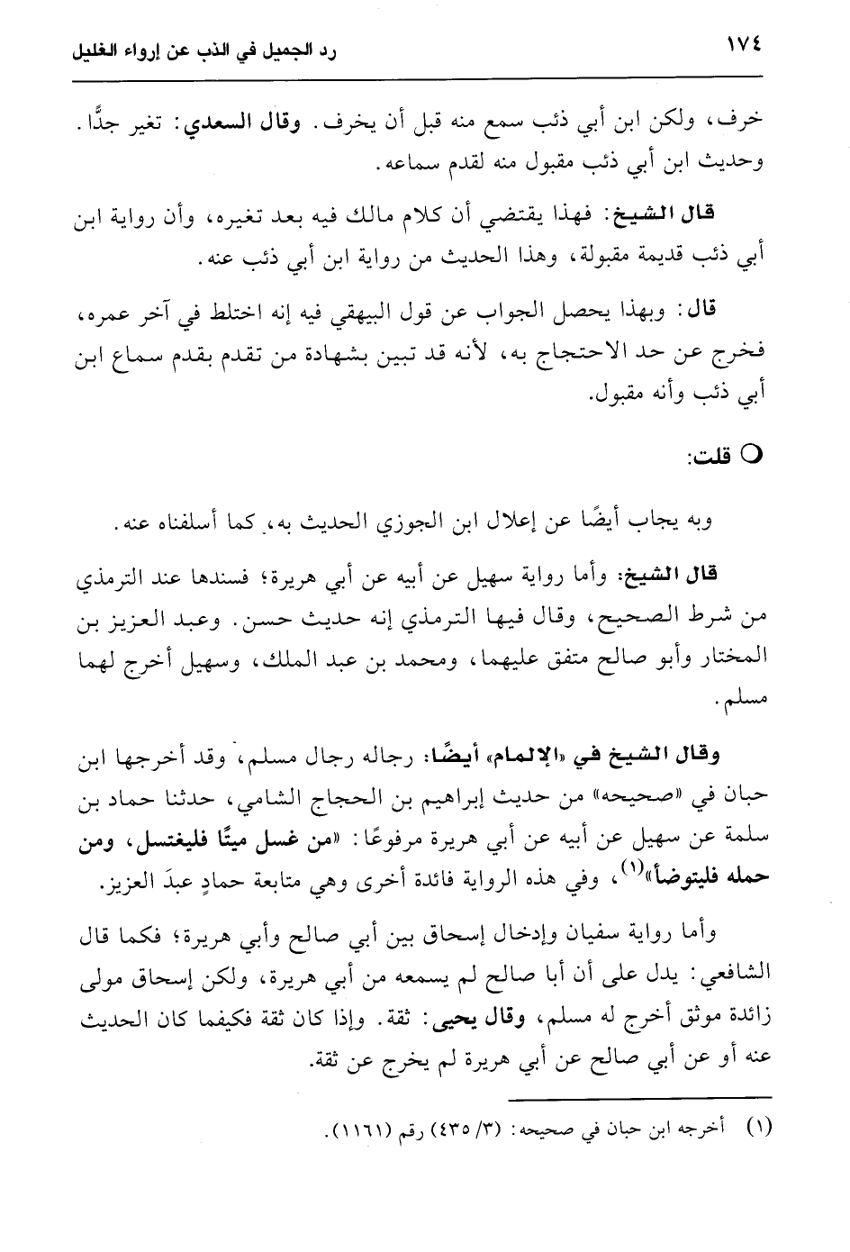 قال الشيخ: وأما رواية سهيل عن أبيه عن أبي هريرة؛ فسندها عند الترمذي من شرط الصحيح، وقال فيها الترمذي إنه حديث حسن. وعبد العزيز بن المختار وأبو صالح متفق عليهما، ومحمد بن عبد الملك، وسهيل أخرج لهما مسلم.