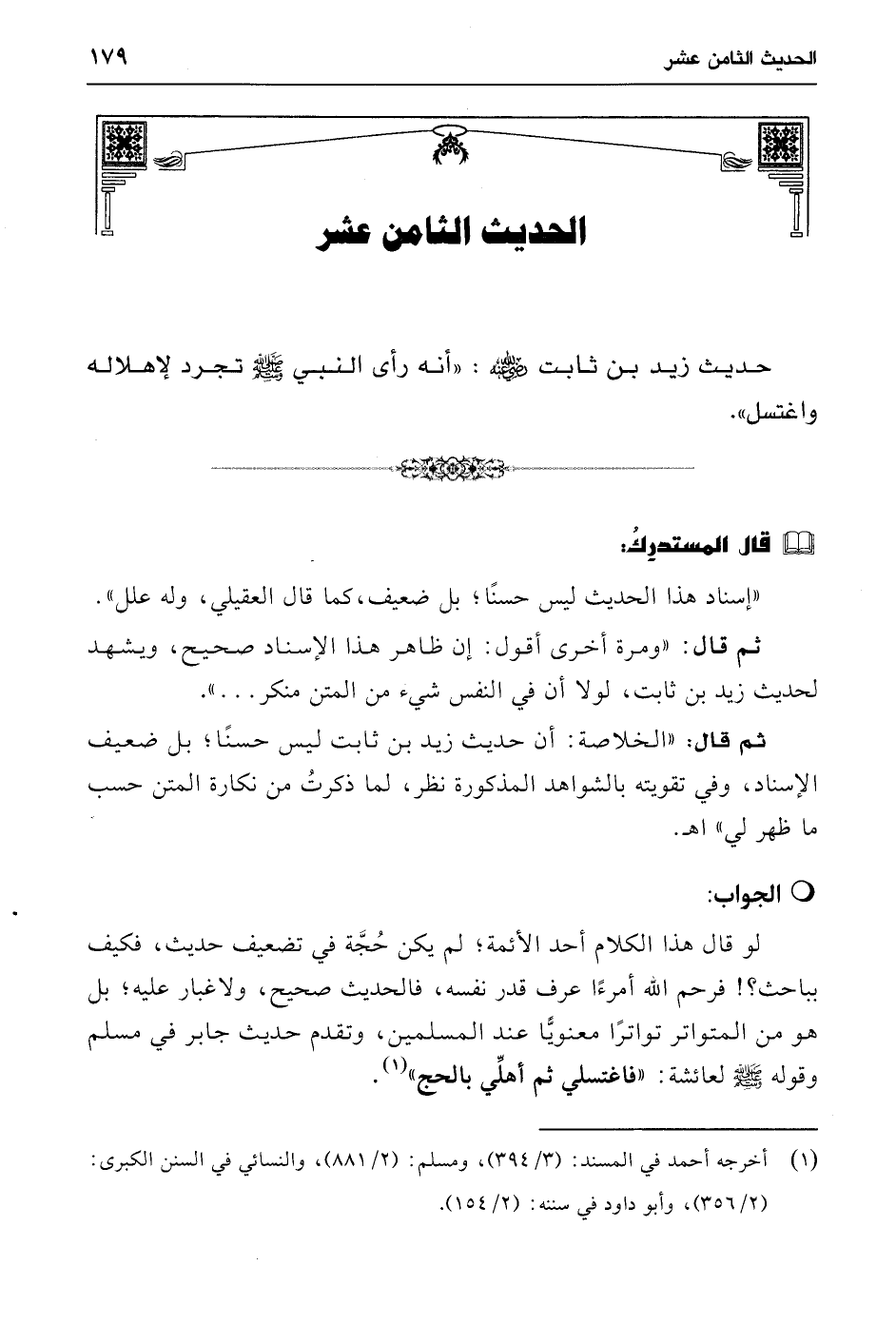 لو قال هذا الكلام أحد الأئمة؛ لم يكن حُجَّة في تضعيف حديث، فكيف بباحث؟! فرحم الله أمرءًا عرف قدر نفسه، فالحديث صحيح، ولا غبار عليه؛ بل هو من المتواتر تواترًا معنويًّا عند المسلمين، وتقدم حديث جابر في مسلم وقوله - صلى الله عليه وسلم - لعائشة: "فاغتسلي ثم أهلِّي بالحج" (¬1).