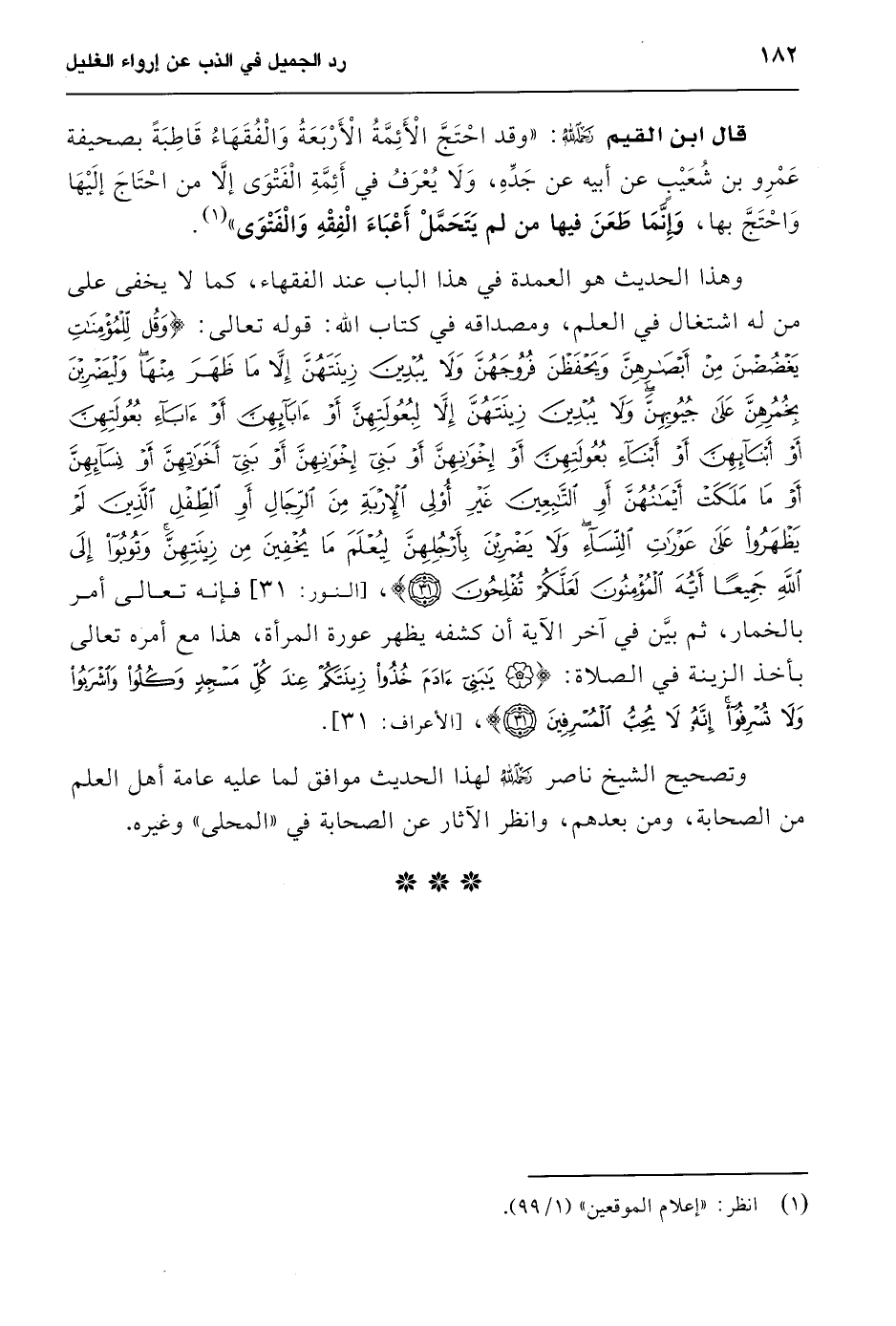 وهذا الحديث هو العمدة في هذا الباب عند الفقهاء، كما لا يخفى على من له اشتغال في العلم، ومصداقه في كتاب الله: قوله تعالى: {وَقُلْ لِلْمُؤْمِنَاتِ يَغْضُضْنَ مِنْ أَبْصَارِهِنَّ وَيَحْفَظْنَ فُرُوجَهُنَّ وَلَا يُبْدِينَ زِينَتَهُنَّ إِلَّا مَا ظَهَرَ مِنْهَا وَلْيَضْرِبْنَ بِخُمُرِهِنَّ عَلَى جُيُوبِهِنَّ وَلَا يُبْدِينَ زِينَتَهُنَّ إِلَّا لِبُعُولَتِهِنَّ أَوْ آبَائِهِنَّ أَوْ آبَاءِ بُعُولَتِهِنَّ أَوْ أَبْنَائِهِنَّ أَوْ أَبْنَاءِ بُعُولَتِهِنَّ أَوْ إِخْوَانِهِنَّ أَوْ بَنِي إِخْوَانِهِنَّ أَوْ بَنِي أَخَوَاتِهِنَّ أَوْ نِسَائِهِنَّ أَوْ مَا مَلَكَتْ أَيْمَانُهُنَّ أَوِ التَّابِعِينَ غَيْرِ أُولِي الْإِرْبَةِ مِنَ الرِّجَالِ أَوِ الطِّفْلِ الَّذِينَ لَمْ يَظْهَرُوا عَلَى عَوْرَاتِ النِّسَاءِ وَلَا يَضْرِبْنَ بِأَرْجُلِهِنَّ لِيُعْلَمَ مَا يُخْفِينَ مِنْ زِينَتِهِنَّ وَتُوبُوا إِلَى اللَّهِ جَمِيعًا أَيُّهَ الْمُؤْمِنُونَ لَعَلَّكُمْ تُفْلِحُونَ} [النور: 31] فإنه تعالى أمر بالخمار، ثم بيَّن في آخر الآية أن كشفه يظهر عورة المرأة، هذا مع أمره تعالى بأخذ الزينة في الصلاة: {يَا بَنِي آدَمَ خُذُوا زِينَتَكُمْ عِنْدَ كُلِّ مَسْجِدٍ وَكُلُوا وَاشْرَبُوا وَلا تُسْرِفُوا إِنَّهُ لا يُحِبُّ الْمُسْرِفِينَ}، [الأعراف: 31].